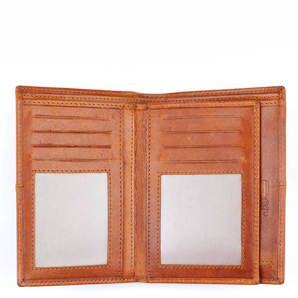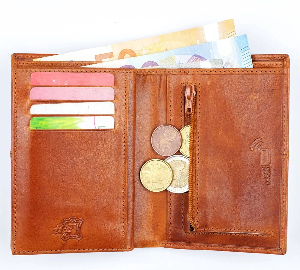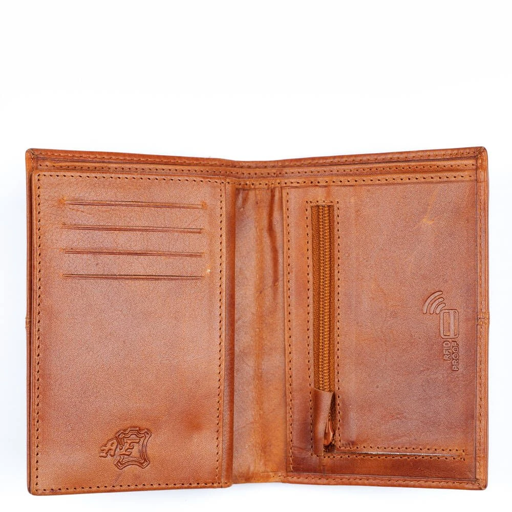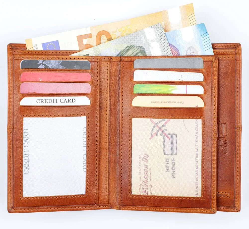 Tyylikäs RFID-suojattu nahkalompakko. 12 korttipaikkaa, joista kaksi on ikkunallisia sekä muita taskuja, taustalla kaksiosainen seteliväli ja kolikoille vetoketjullinen pikkutasku.