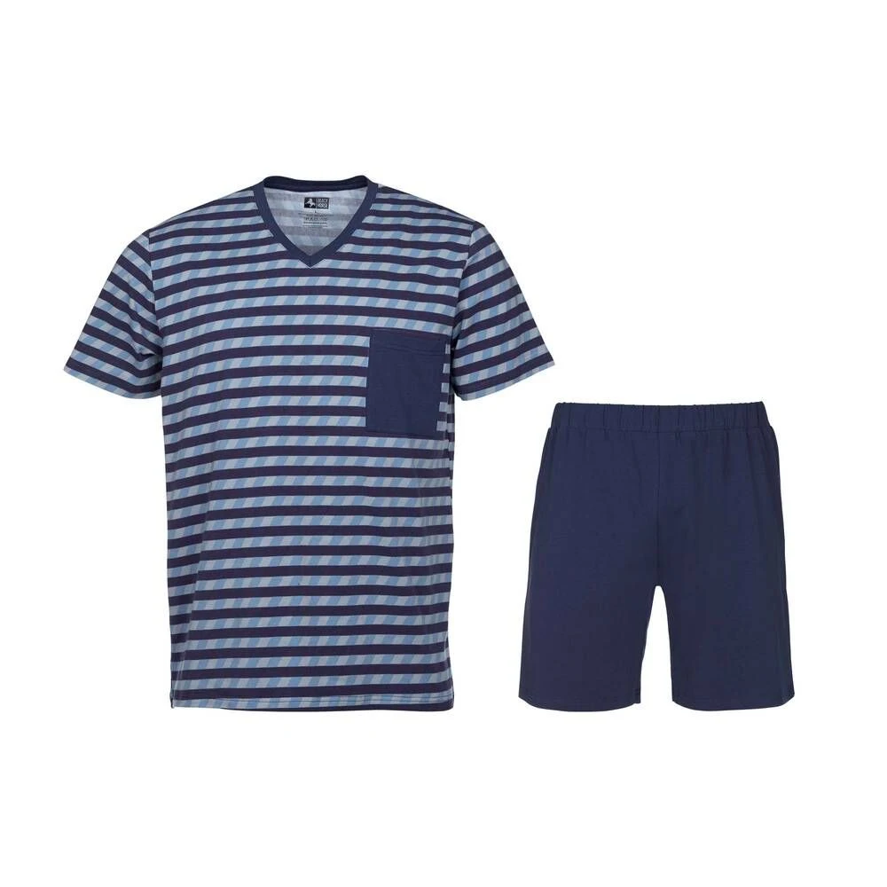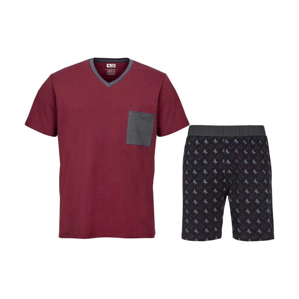 Väljä shortsipyjama yksivärisellä paidalla ja kuosillisilla shortseilla. Paidassa on rintatasku ja shortseissa kuminauhavyötärö.