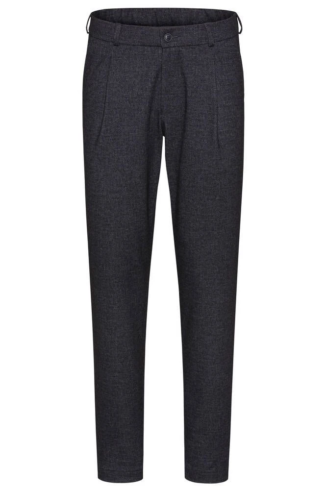 Miesten siistit housut etupuolen tyylikkäillä laskoksilla. Joustava materiaali parantaa housujen istuvuutta.