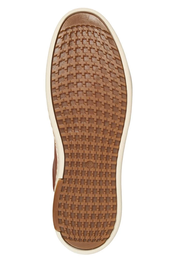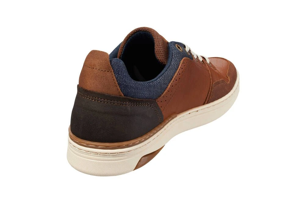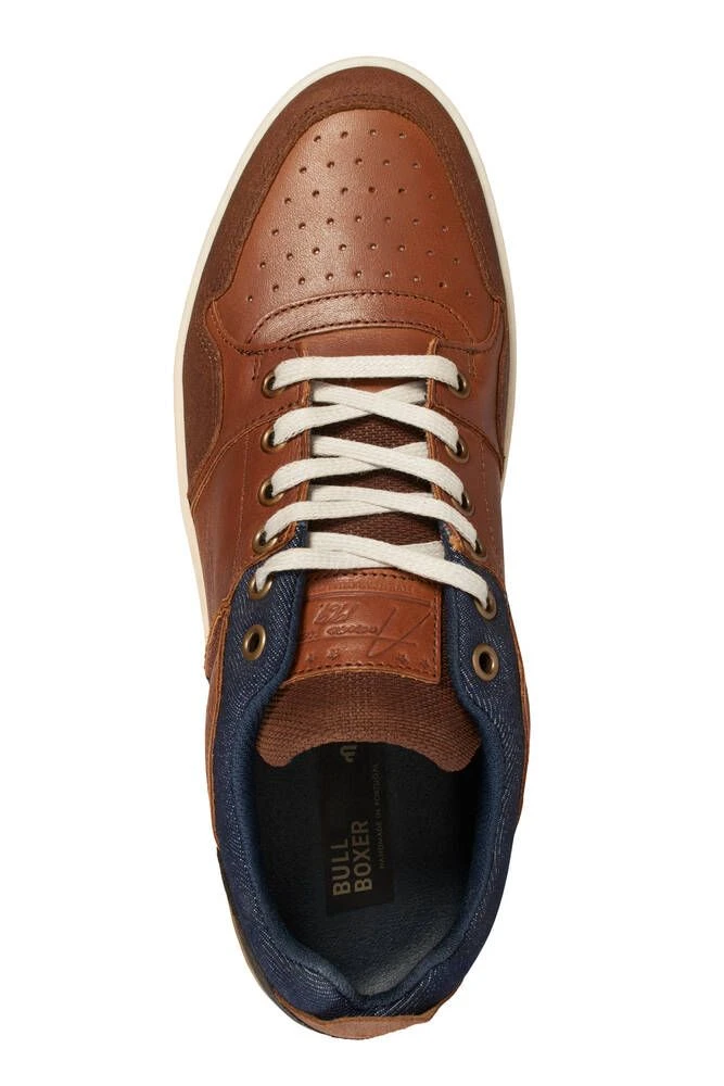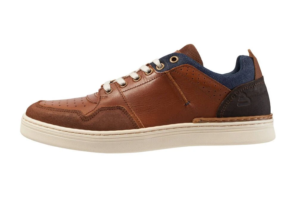 Nahkapintaiset tennarit mokkaisilla yksityiskohdilla ja vaalealla pohjalla.
