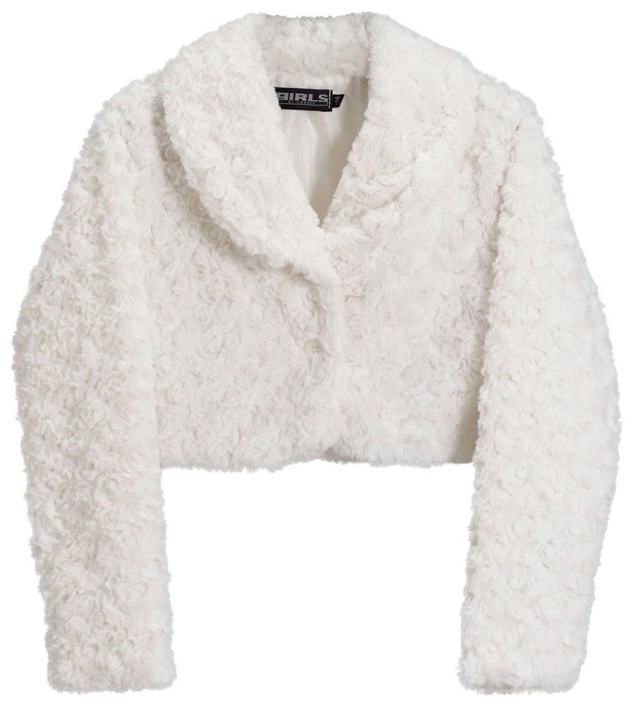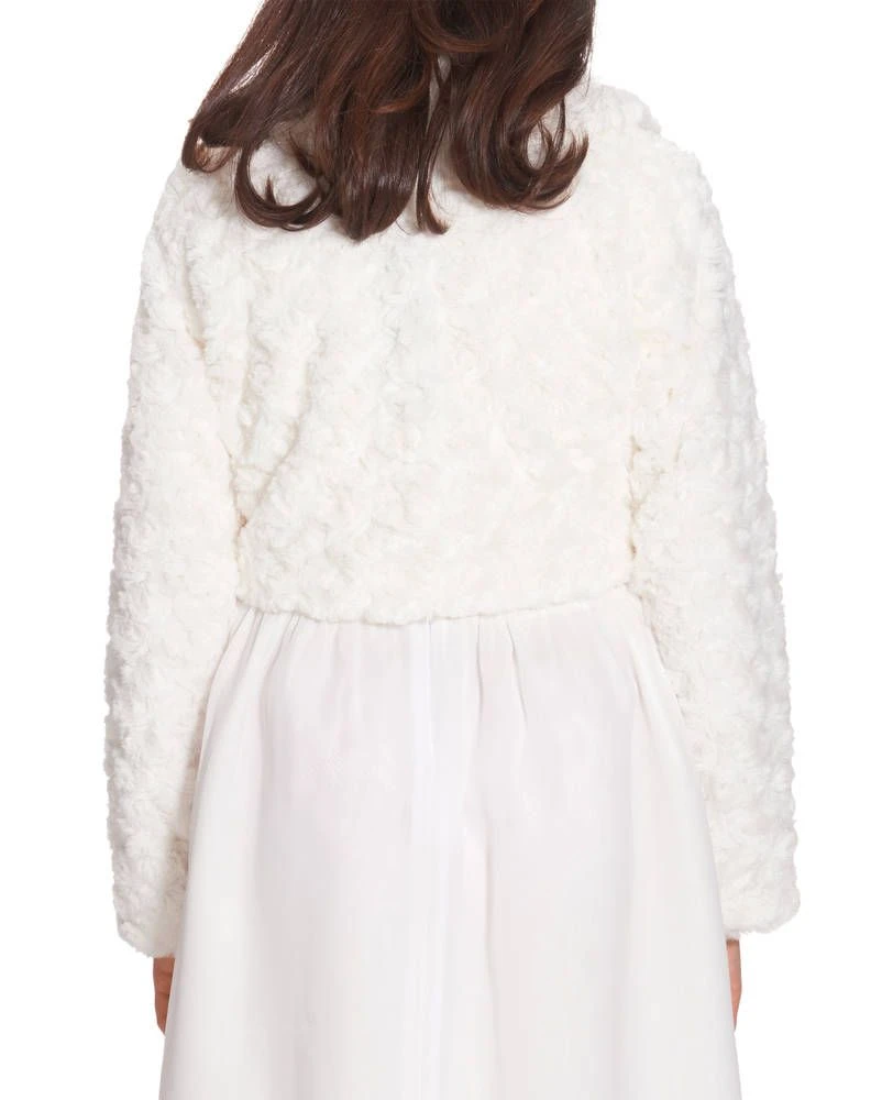 Ihana pörröinen karvabolero, jossa on pitkät hihat ja upea kaulus. Pehmeässä bolerossa on nappikiinnitys. Malli on kokoa 134 ja käyttää bolerosta kokoa 134. Boleron koon 134 keskitakapituus 31 cm.