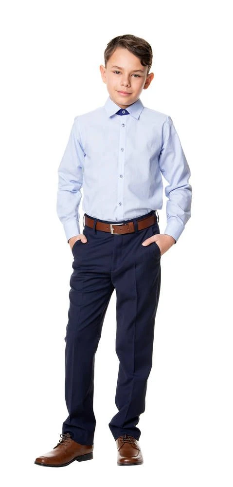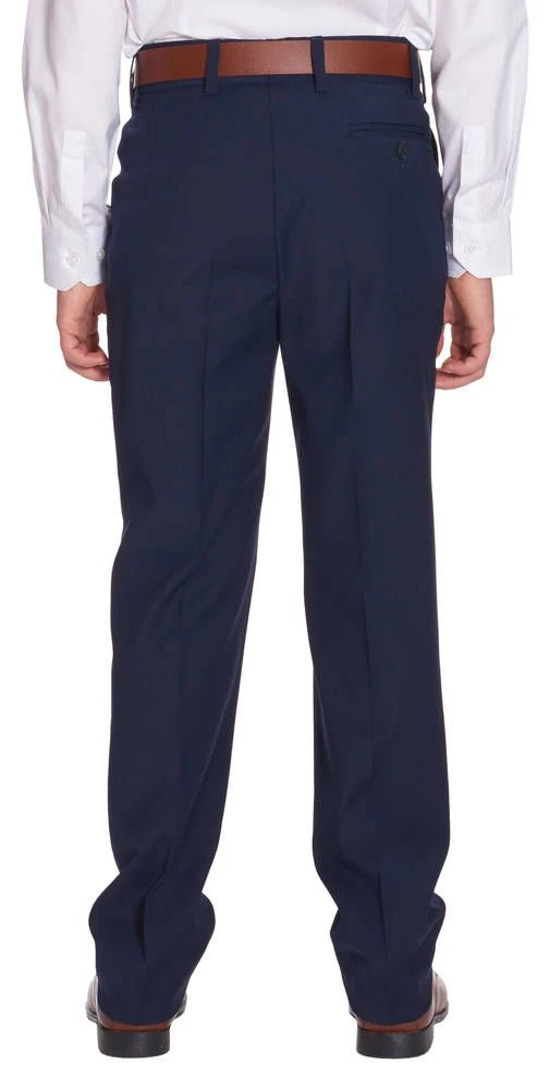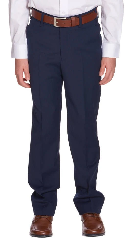Upeat siniset villasekoitehousut. Housujen etupuolella on kaksi tilavaa avotaskua ja takana yksi napillinen tasku. Vyötäröllä on vyölenkit. Koon 146 B (solakka mitoitus) vyötärönympärys 64 cm, sisäsauman pituus 63 cm ja alisuun leveys 32 cm.
