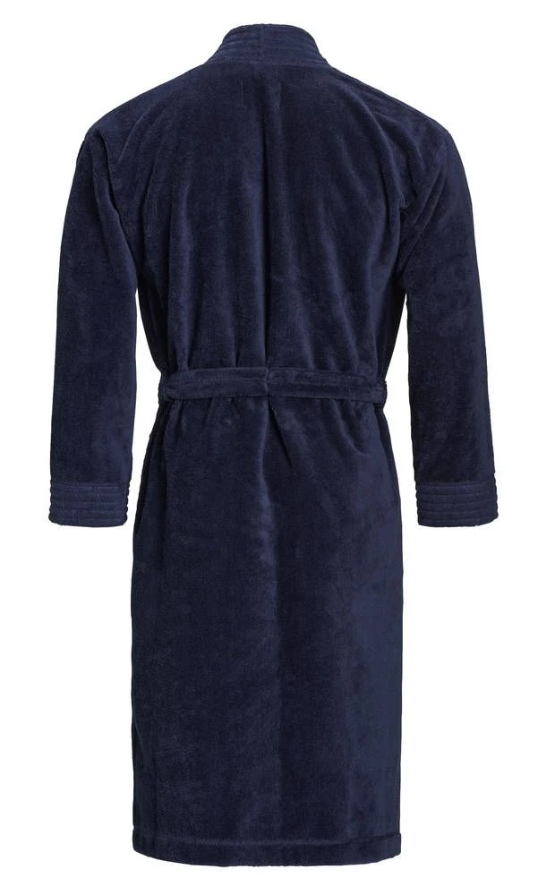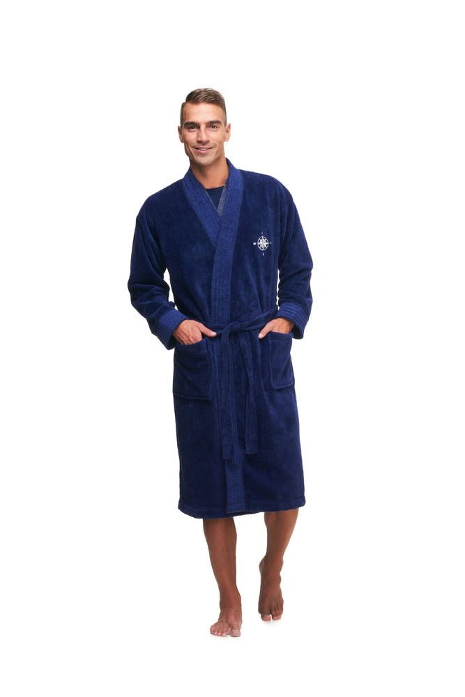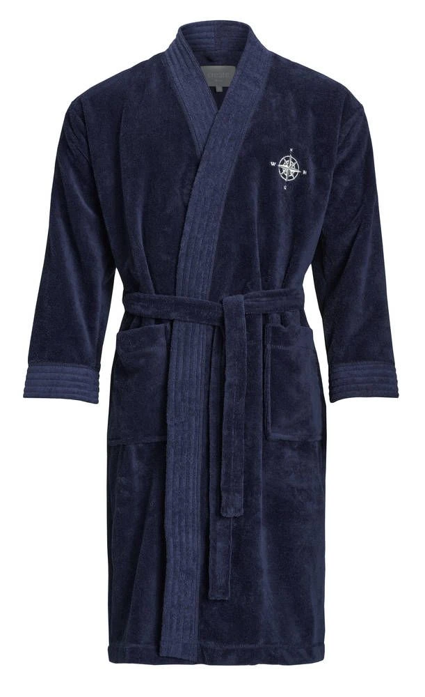 Pehmeä kylpytakki solmittavalla vyöllä. Rinnassa on brodeerattu kompassi.