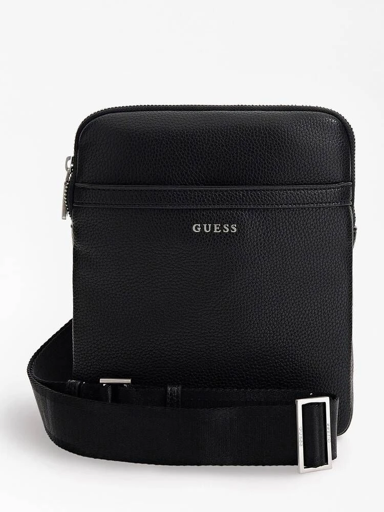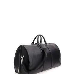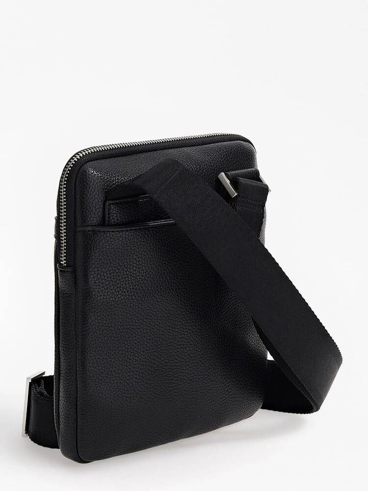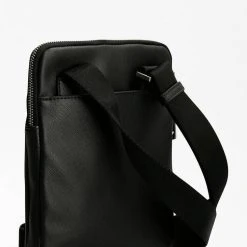 Struktuuripintainen laukku etupuolen kirjainlogolla ja vetoketjukiinnityksellä.
