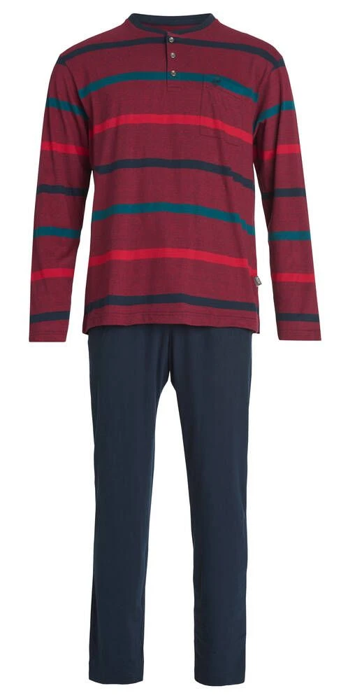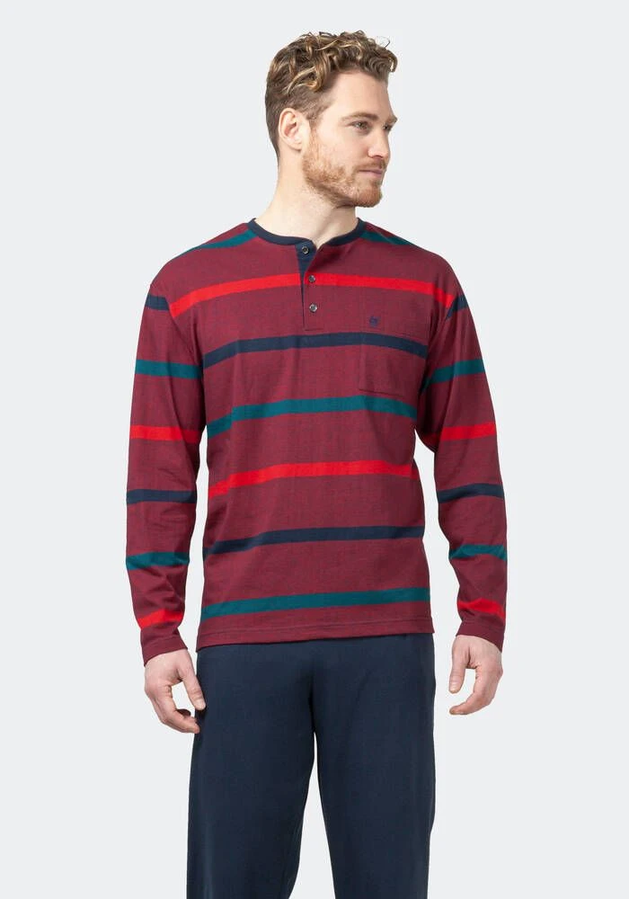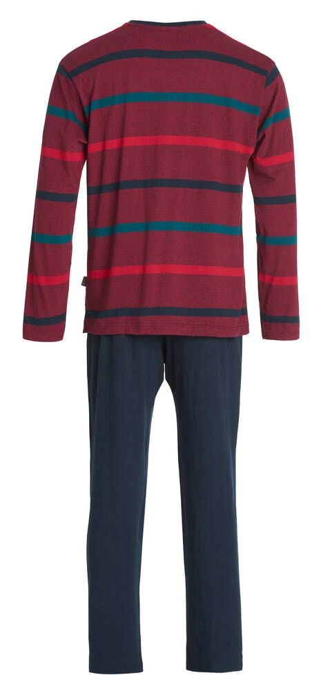 Mukava pyjama pitkähihaisella paidalla ja pitkillä yksivärisillä housuilla. Raidallisessa paidassa on rintatasku ja pääntiellä lyhyt nappilista.