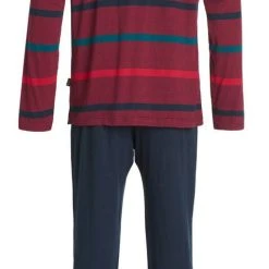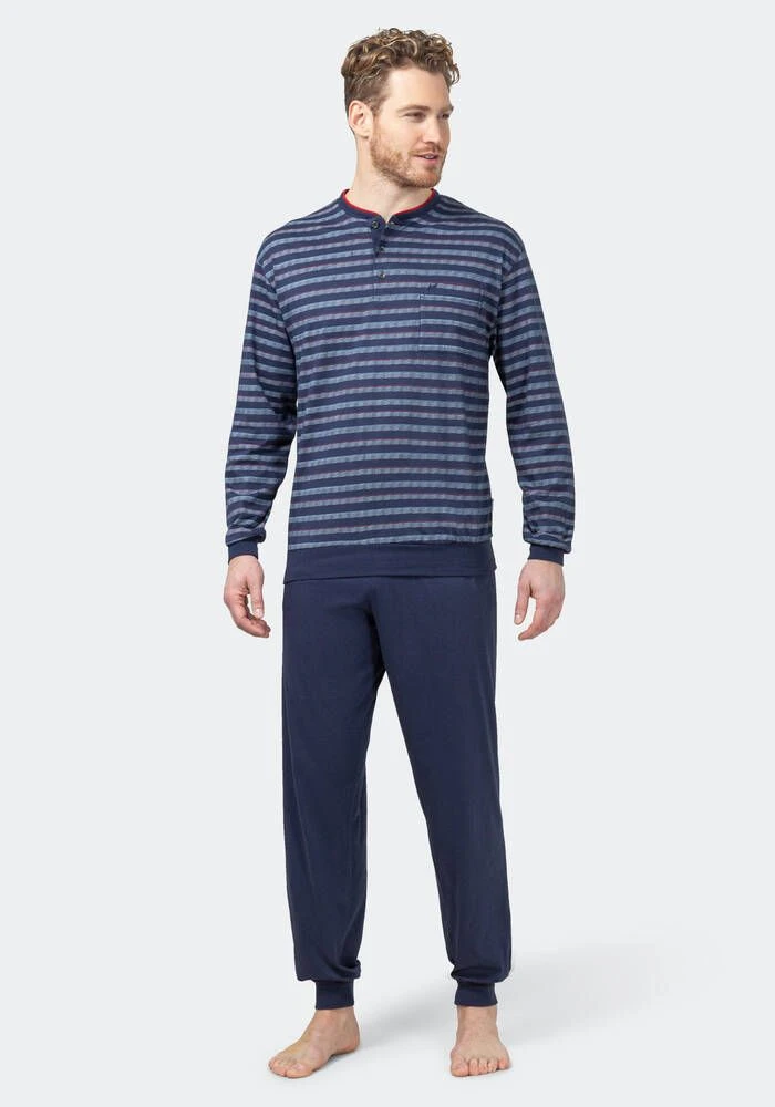 Siisti pyjama pitkähihaisella raitapaidalla ja yksivärisillä housuilla. Paidassa on rintatasku ja pääntiellä lyhyt nappilista. Hihansuissa ja lahkeissa on leveät resorit.