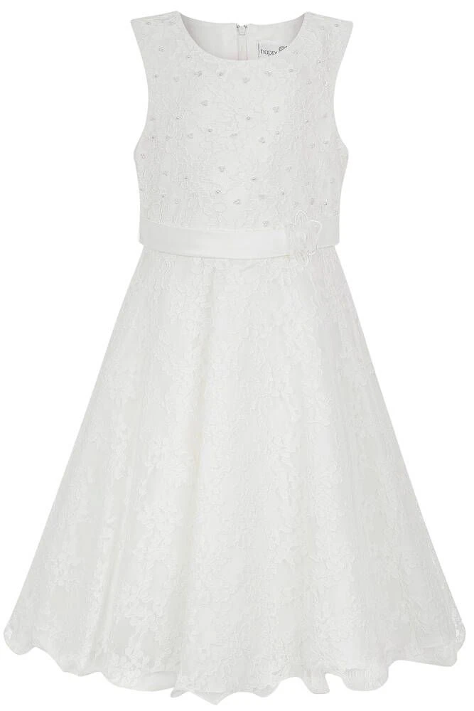 Lasten yksivärinen pitsimekko vyötärön kukkakoristeella.
