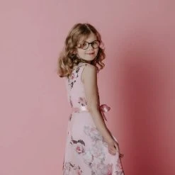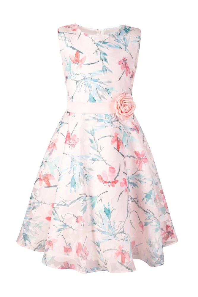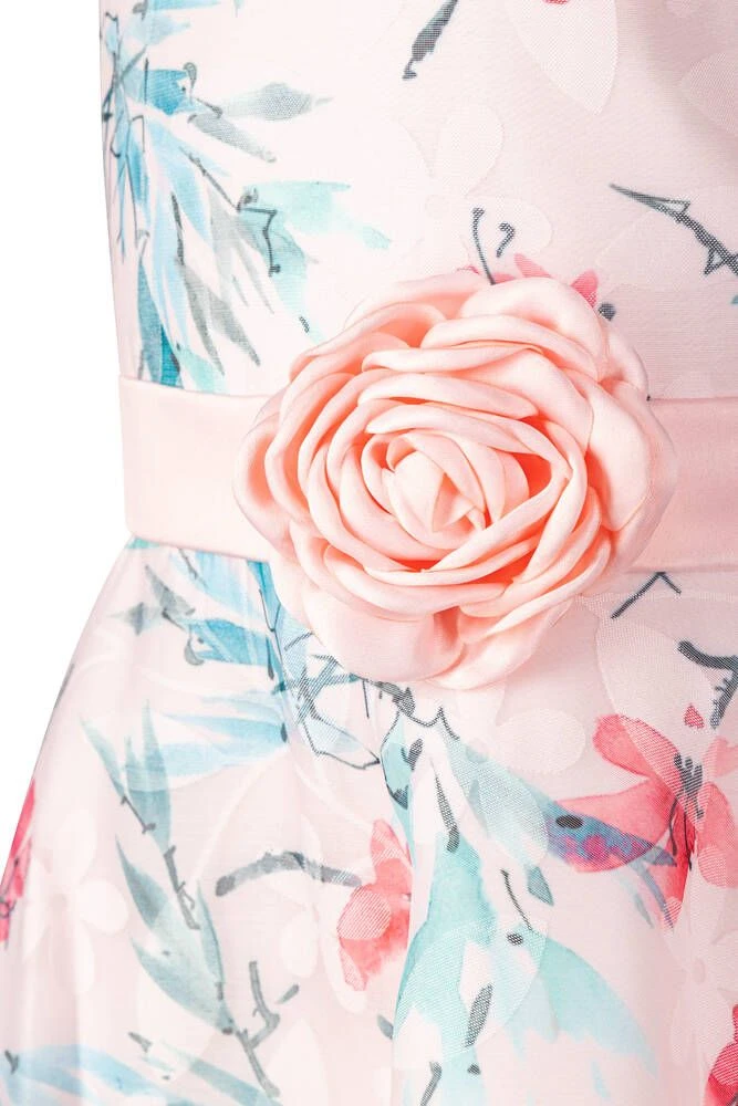 Lasten hihaton kukkamekko leveällä helmalla. Vyötäröllä on kaunis ruusukoriste.