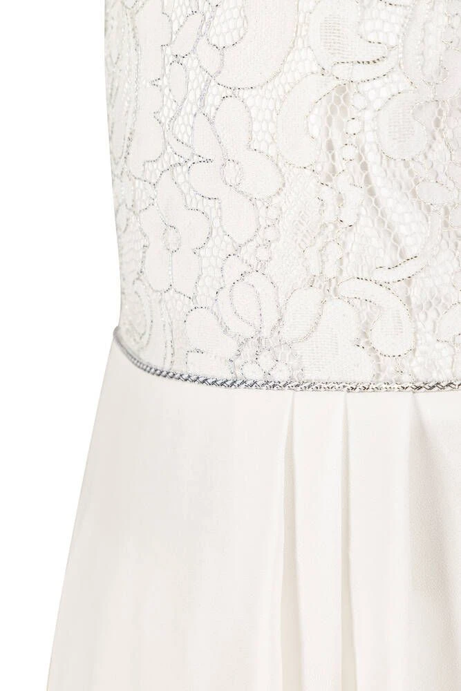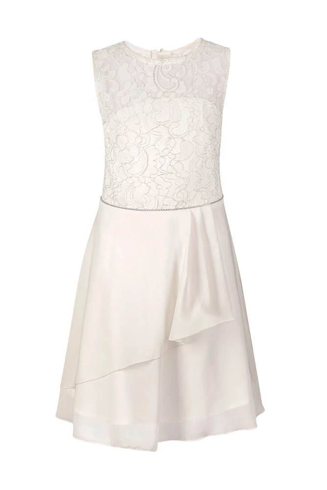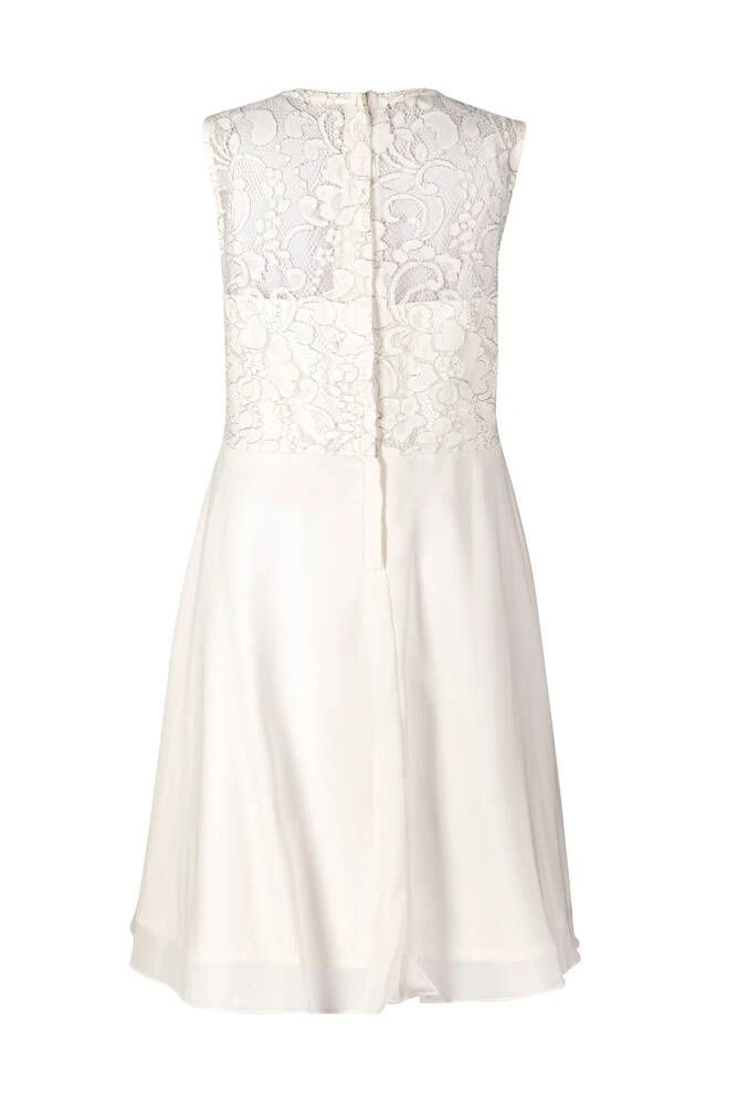 Lasten hihaton juhlamekko kerrostetulla helmalla. Mekon yläosa on kaunista pitsiä ja helma läpikuultavaa sifonkia.
