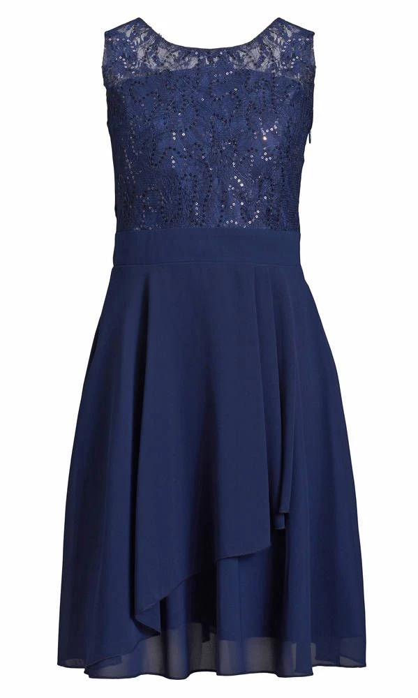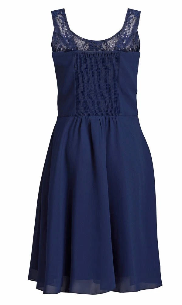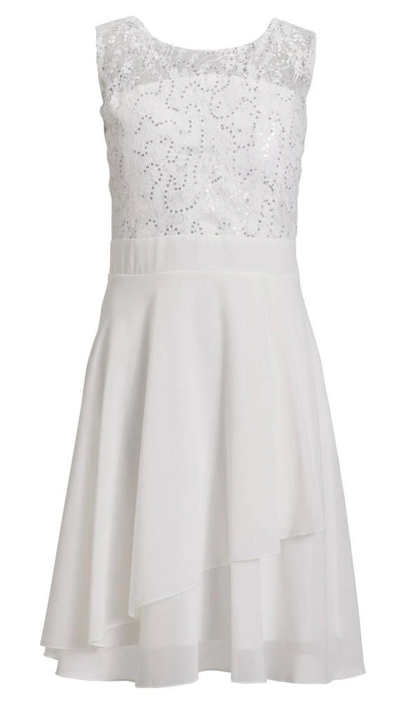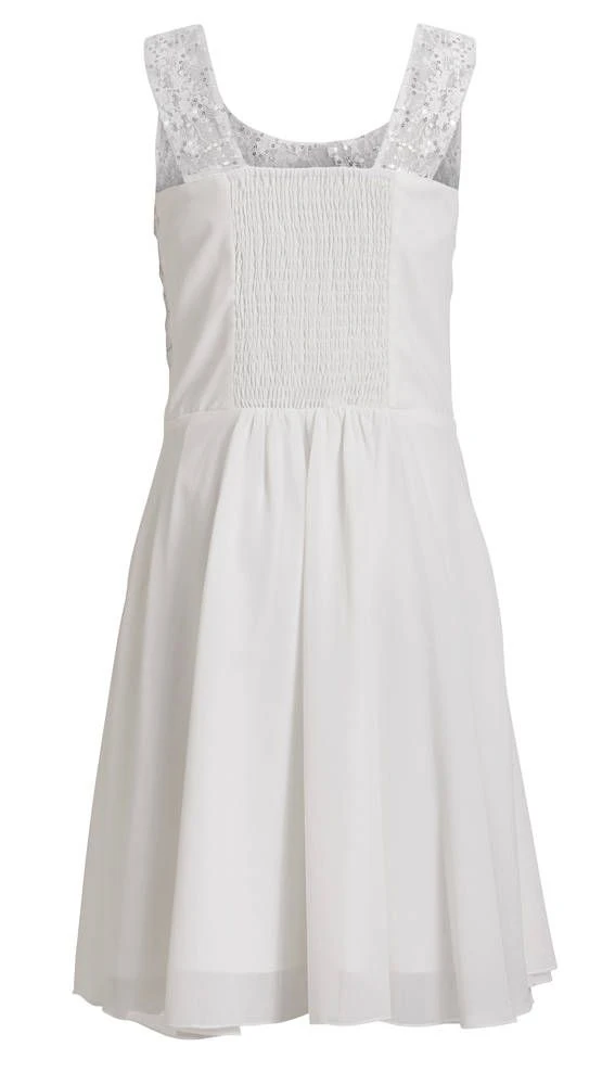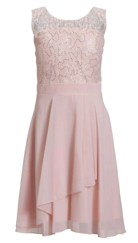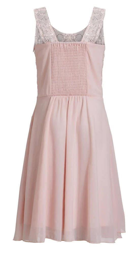Ihana hihaton sifonkimekko pitsisellä yläosalla. Yläosassa on kiiltävät paljettikoristeet. Mekon yläosan selkäpuolella on joustava osa, joka takaa loistavan istuvuuden ja käyttömukavuuden.