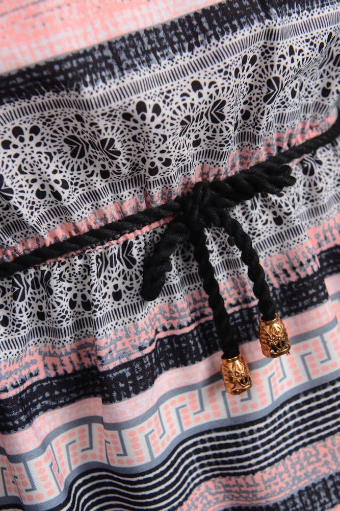 Monikäyttöinen mekko geometrisellä kuviolla. Vyötäröllä on kiristyskuminauha sekä punottu vyö ja sivulla pukemista helpottava vetoketjukiinnitys.