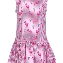 Leikkisä hihaton trikoomekko raitakuvioisella pohjalla ja flamingoprintillä. Mekossa on ihana frillahelma sekä niskassa nappikiinnitys.