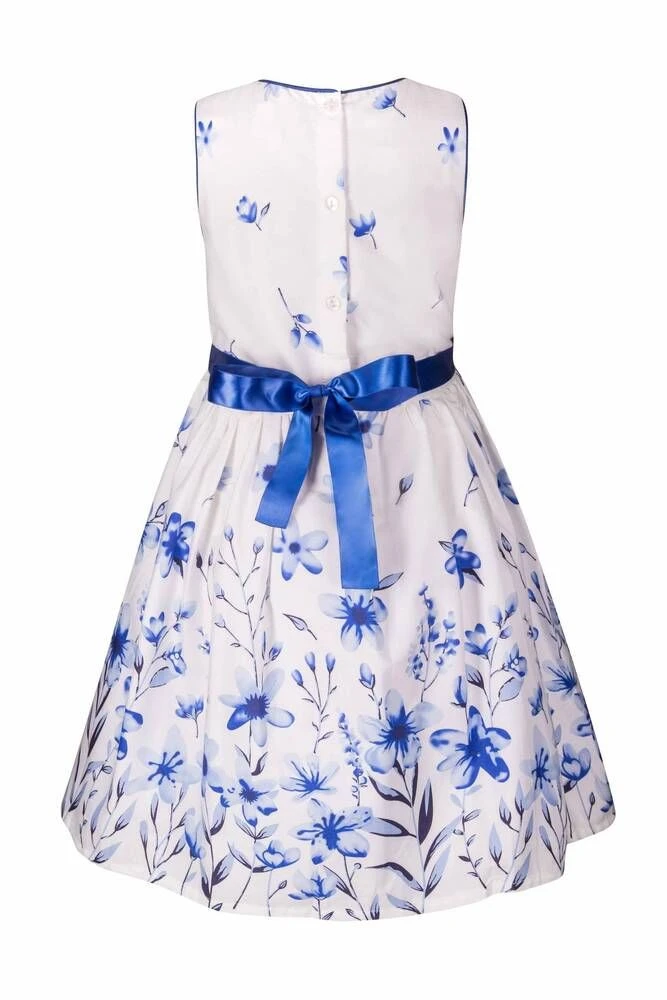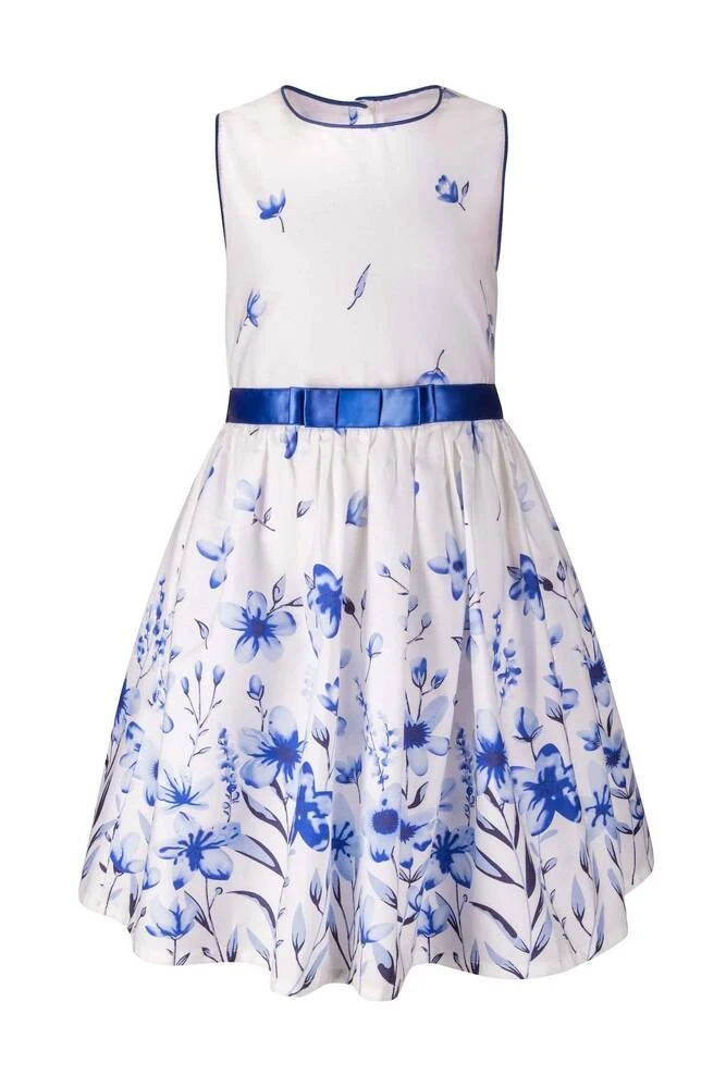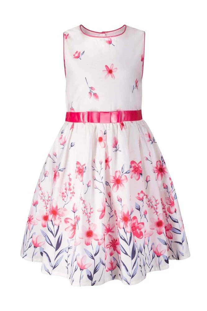 Lasten valkopohjainen juhlamekko kukallisella helmalla. Vyötäröllä on solmittava satiininauha.
