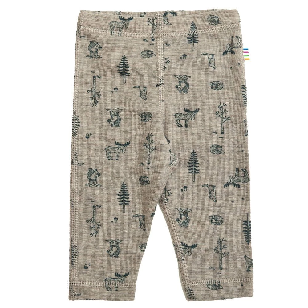 Meleeratut villaleggingsit suloisella metsäprintillä. Johan käyttämä korkealaatuinen villa on mulesing – vapaata. Villa imee kosteutta ja sekä säätelee kehon lämpötilaa viilentäen kesällä ja lämmittäen talvella. Nämä villan ominaisuudet tekevät siitä rauhoittavan ja miellyttävän materiaalin erityisesti vauvoille. Villa puhdistaa itse itseään, joten villavaatteita kannattaa tuulettaa käytön jälkeen ja näin säästämme luontoa.