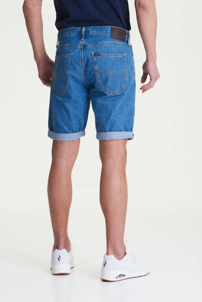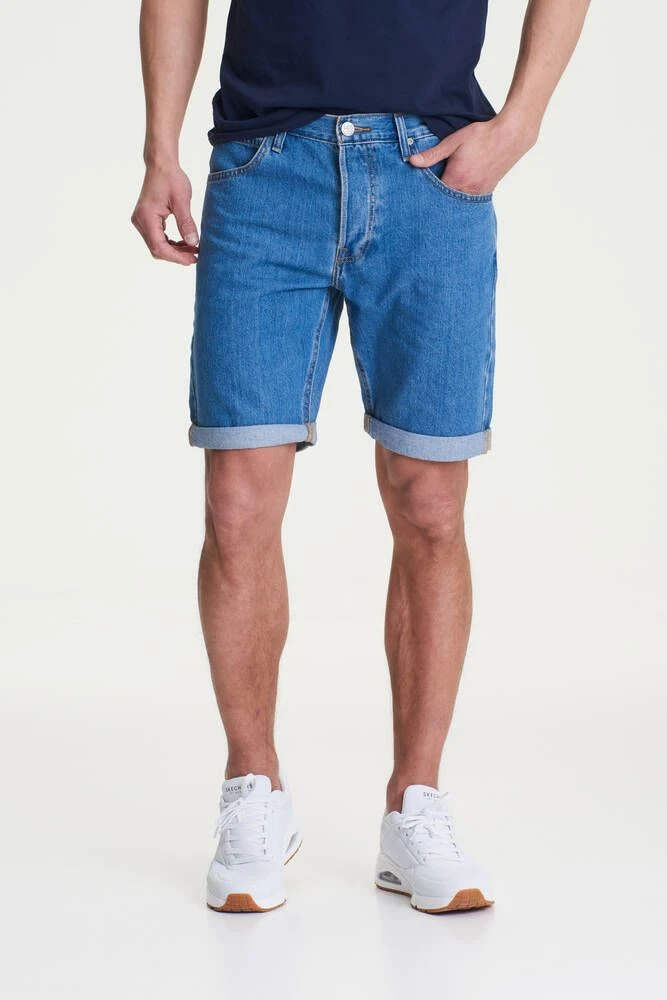 Lyhytlahkeiset shortsit tyylikkäällä keskisinisellä pesulla. Shortseissa on etu- ja takataskut sekä käännetyt lahkeensuut. Toisen etutaskun sisäpuolella on tilava kolikkotasku.