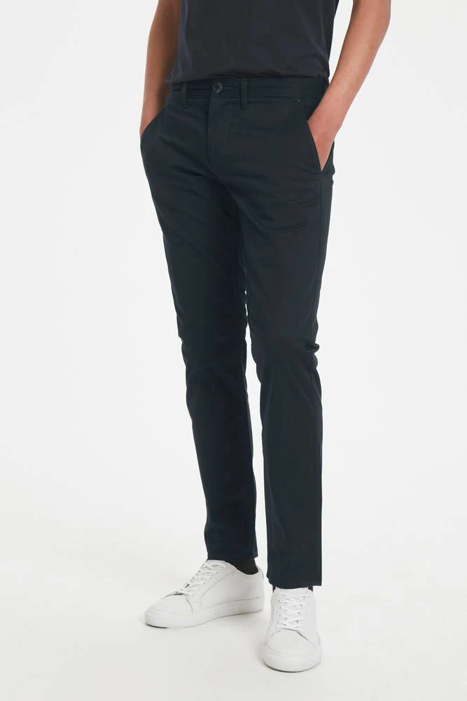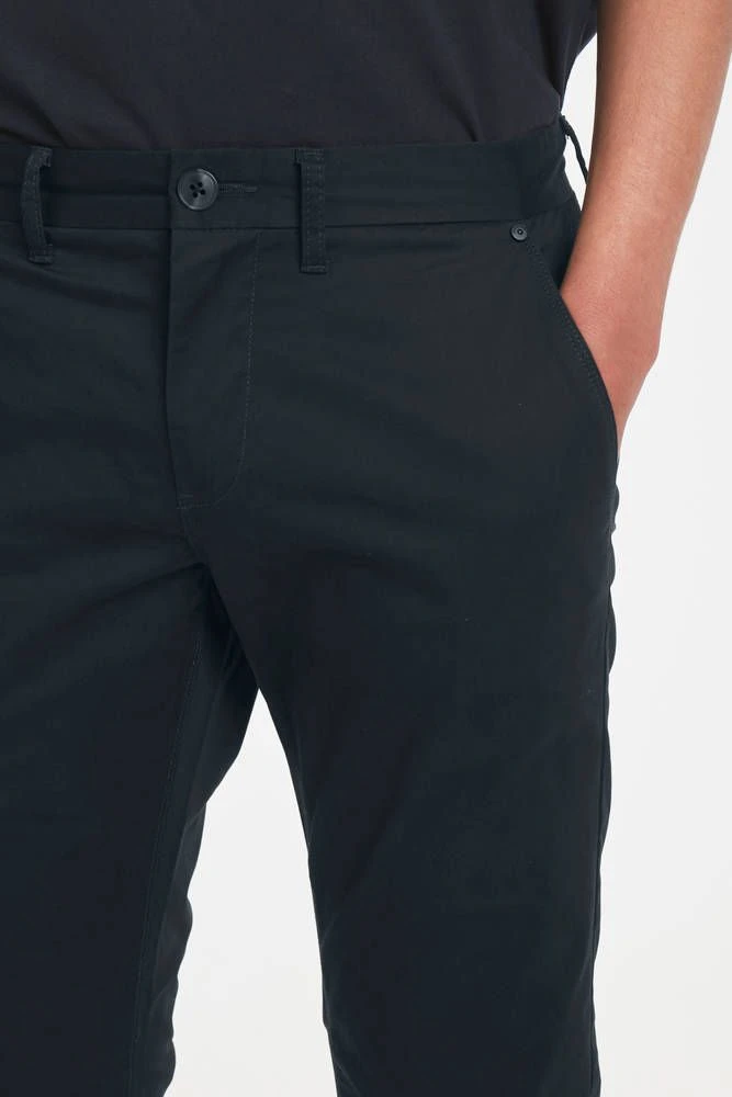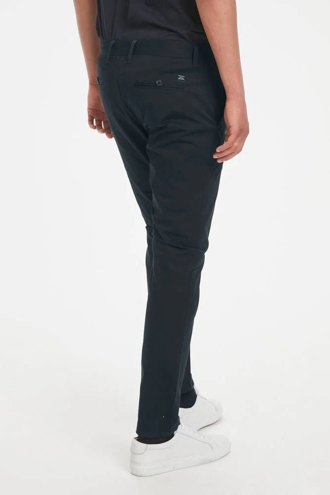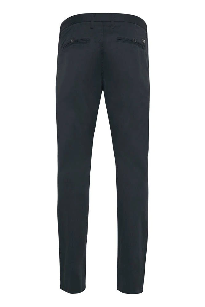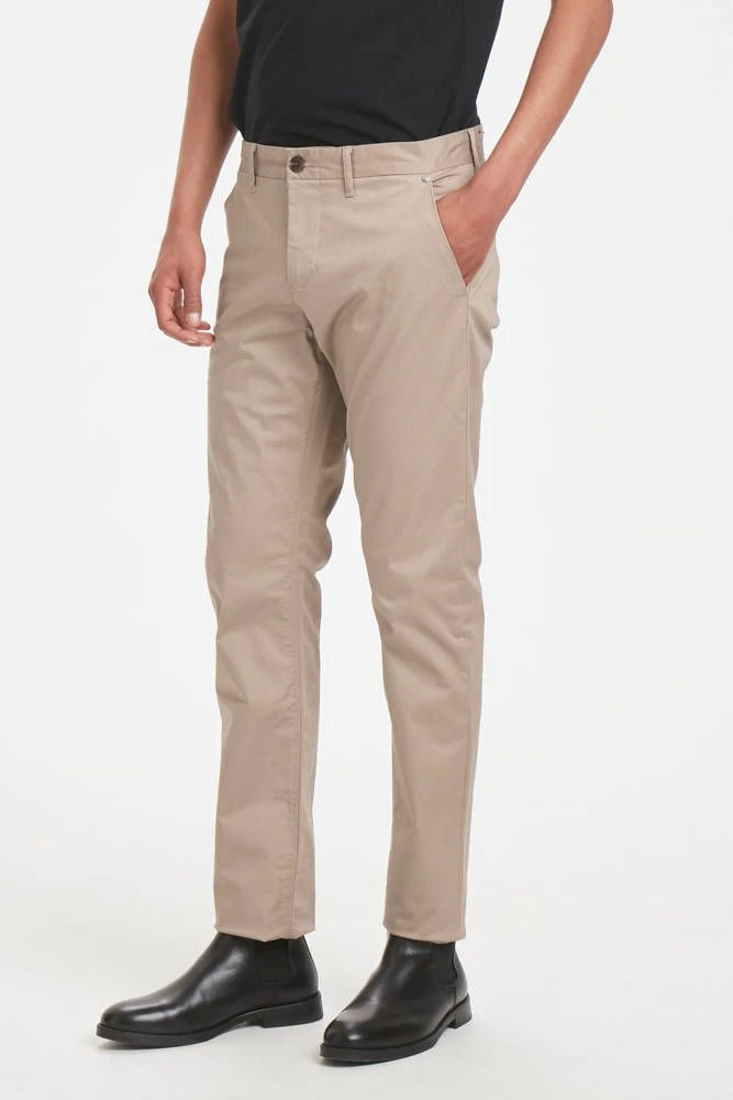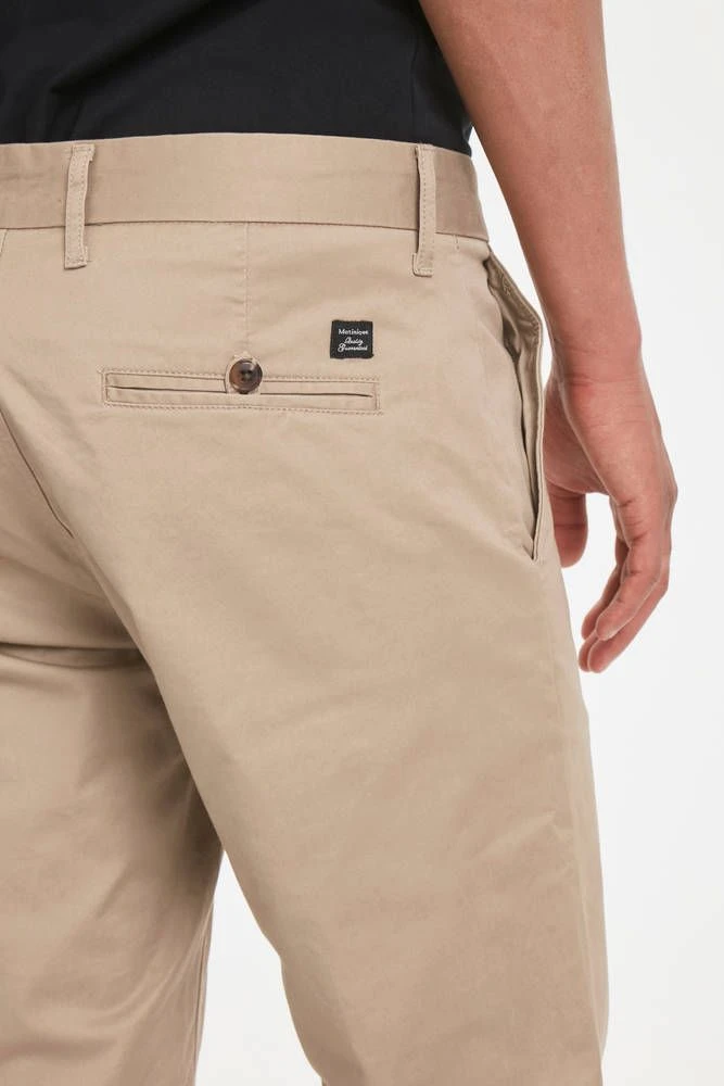 Siistit yksiväriset puuvillachinot kapeahkolla lahkeella. Housujen etupuolella on vinot avotaskut ja takana napilliset takataskut. Joustava materiaali lisää housujen käyttömukavuutta.