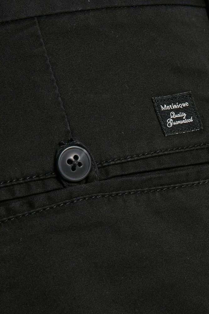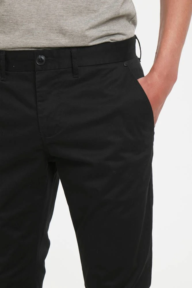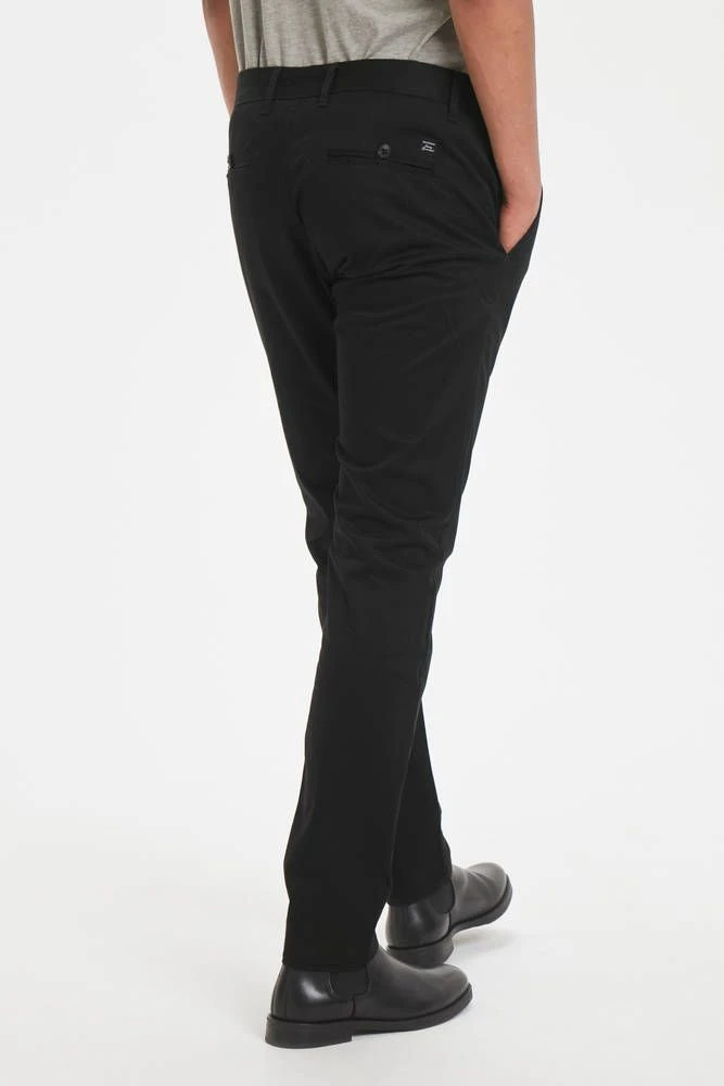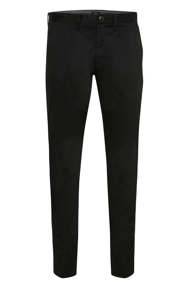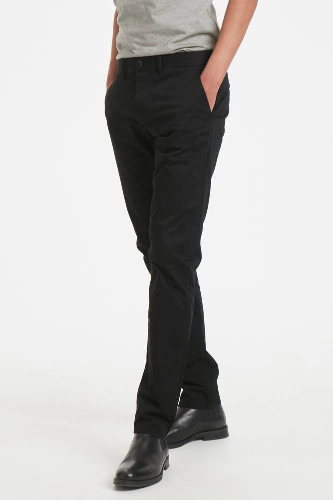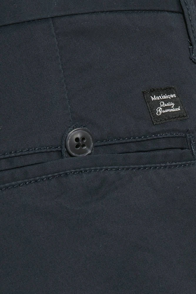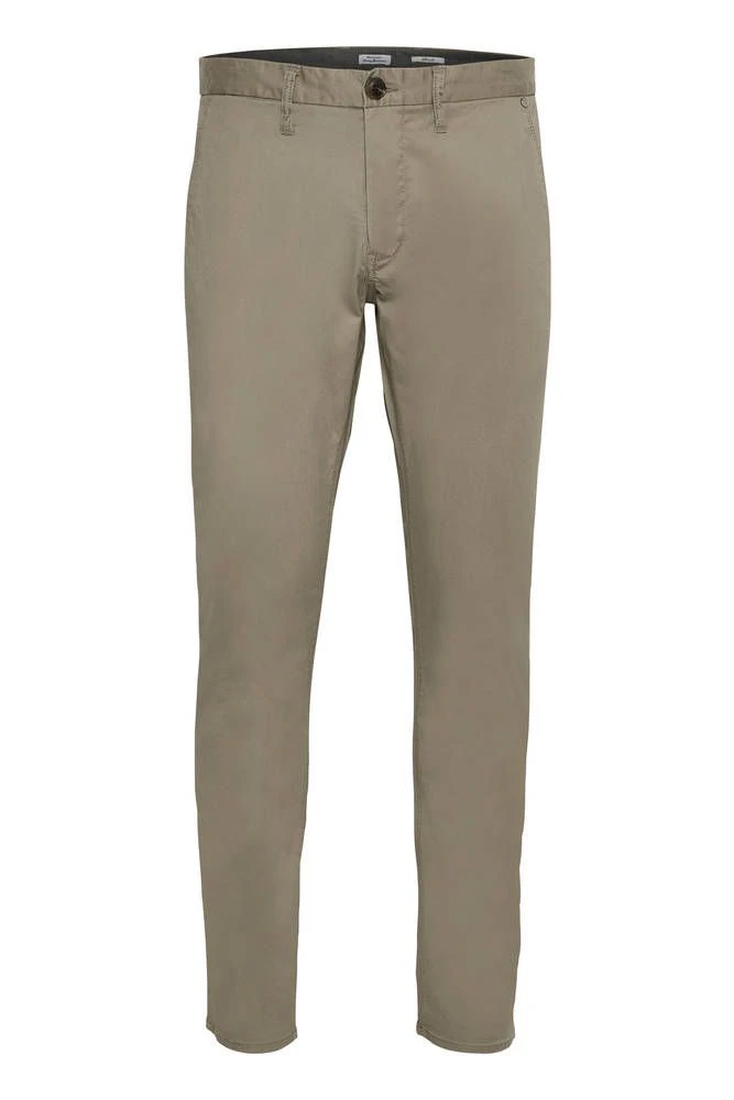 Siistit yksiväriset puuvillachinot kapeahkolla lahkeella. Housujen etupuolella on vinot avotaskut ja takana napilliset takataskut. Joustava materiaali lisää housujen käyttömukavuutta.