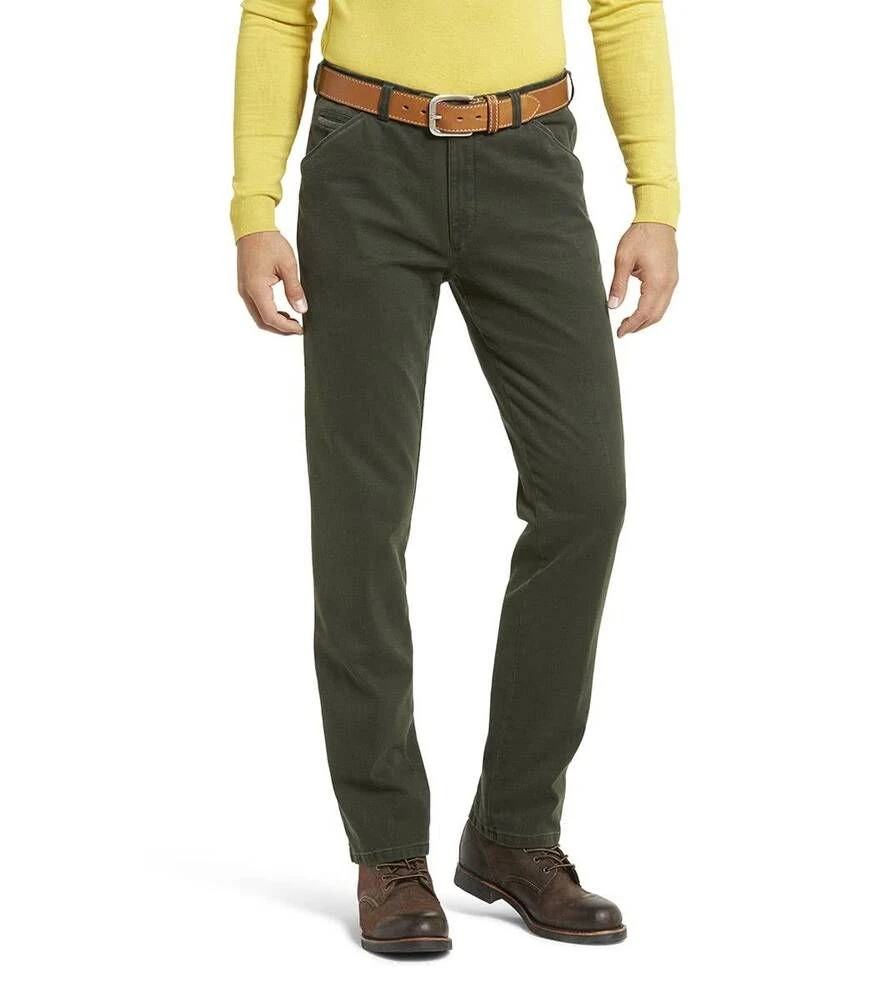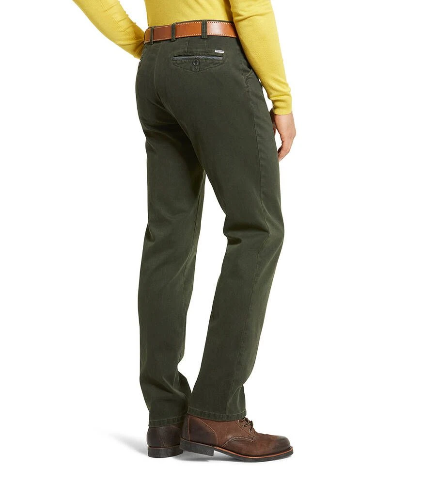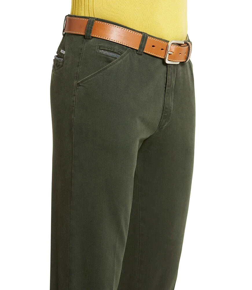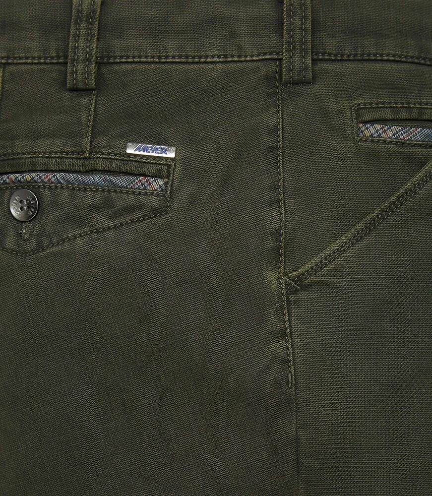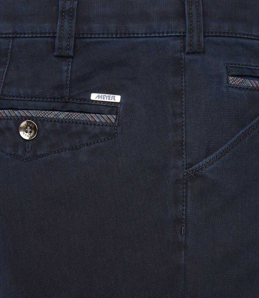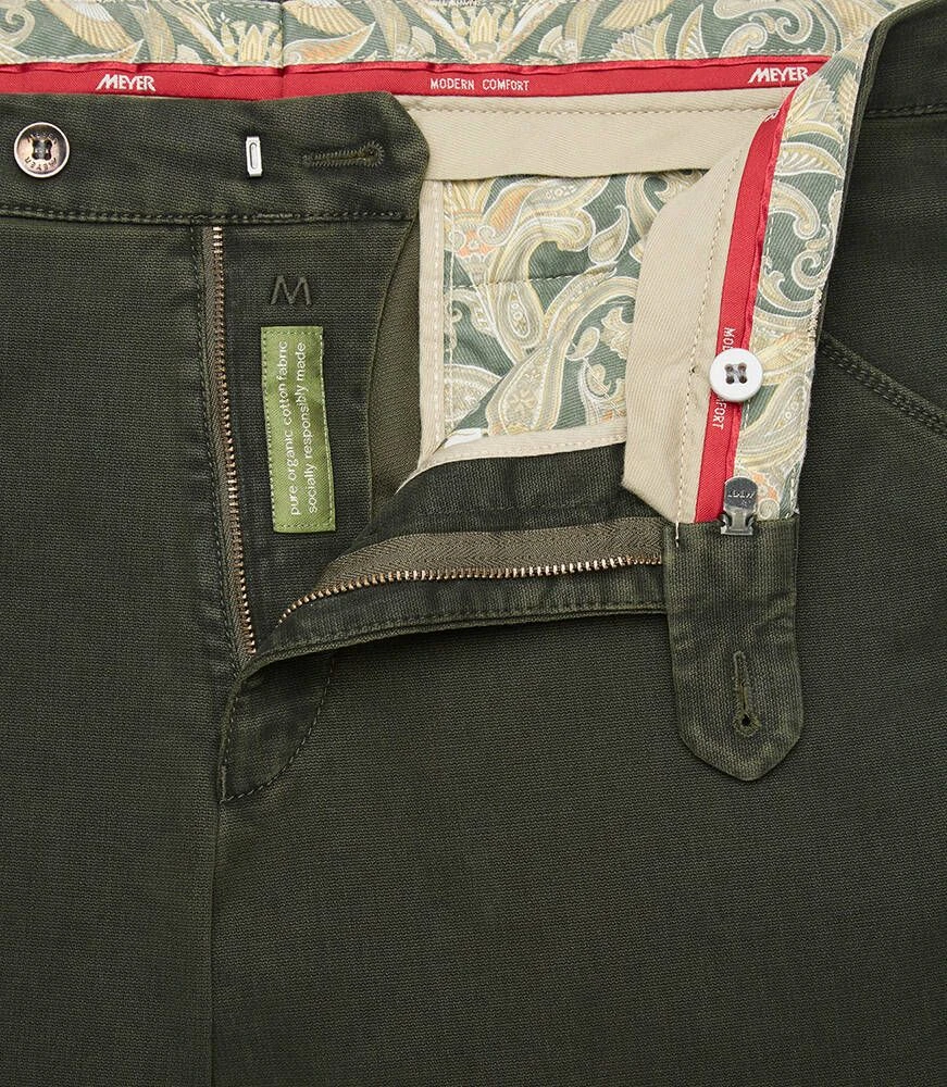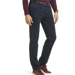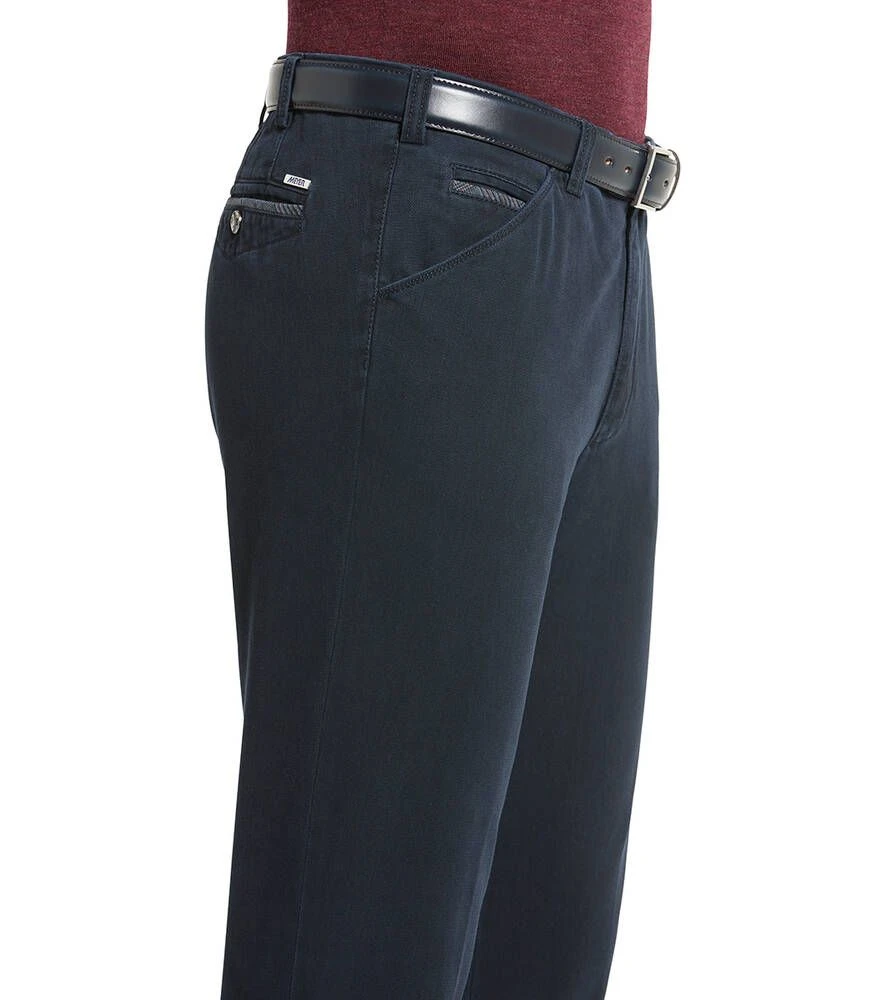 Siistit puuvillahousut etu- ja takataskuilla. Toisen etutaskun sisällä on vetoketjullinen turvatasku. Joustava materiaali lisää käyttömukavuutta.