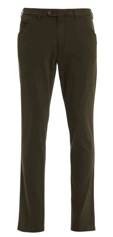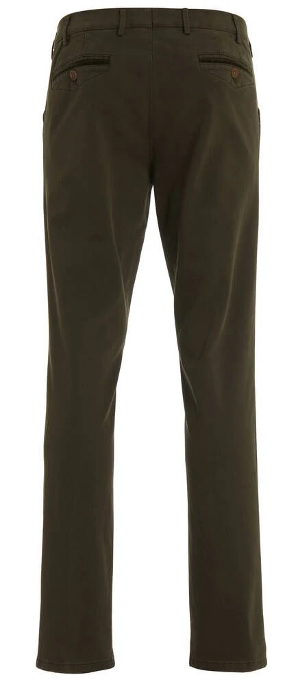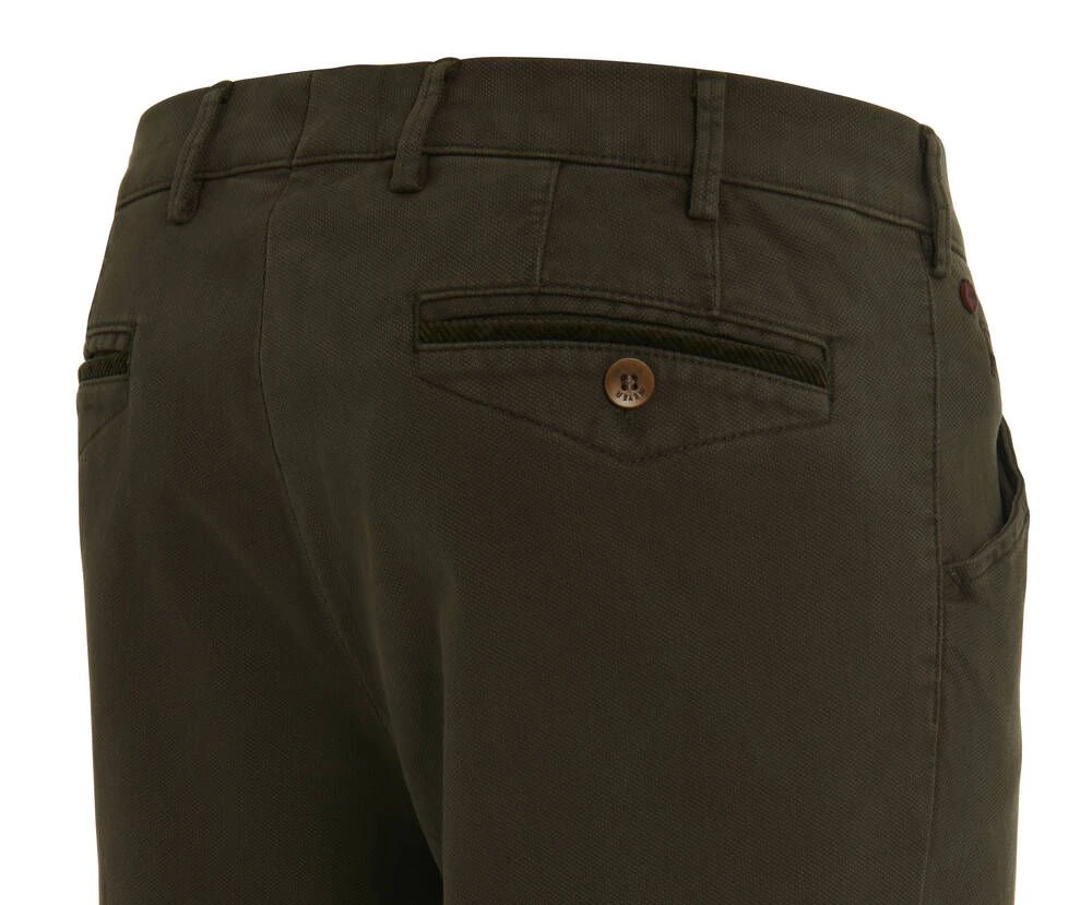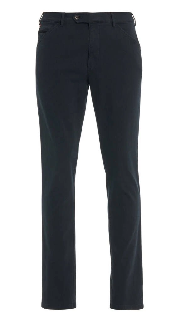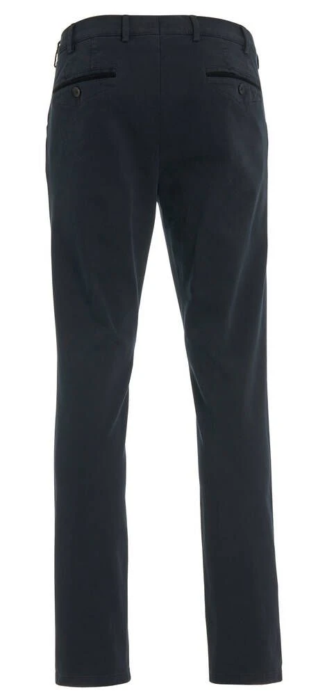 Miesten puuvillaiset housut, joissa on tyylikäs eläväinen pinta sekä samettiset yksityiskohdat. Yksivärisissä housuissa on etu- ja takataskut sekä toisen etutaskun sisällä vetoketjullinen turvatasku. Aavistuksen joustava materiaali parantaa housujen istuvuutta ja lisää käyttömukavuutta.