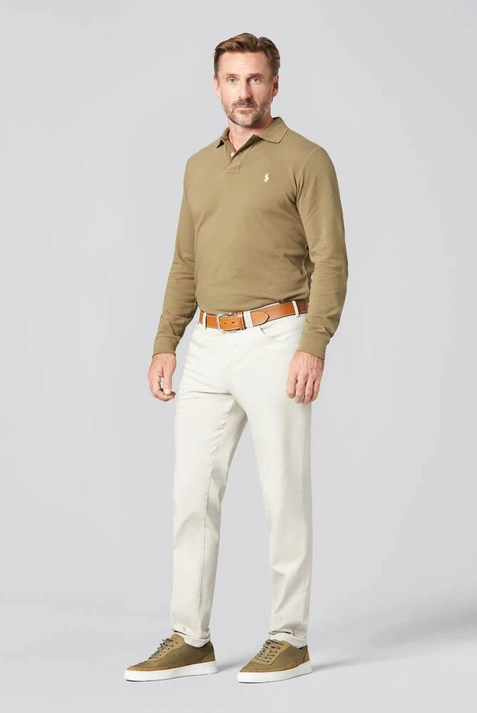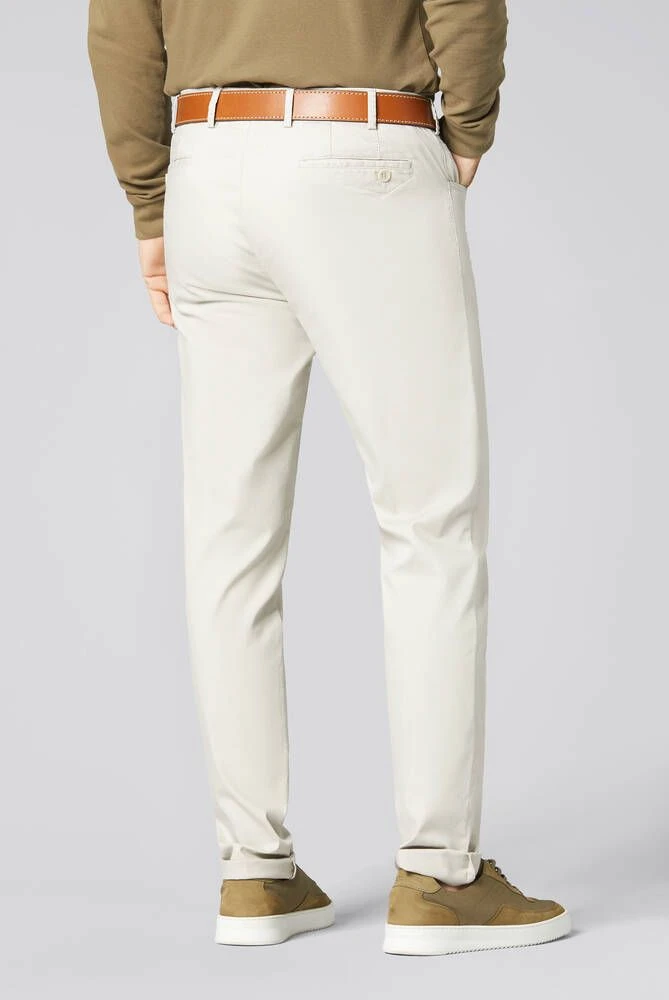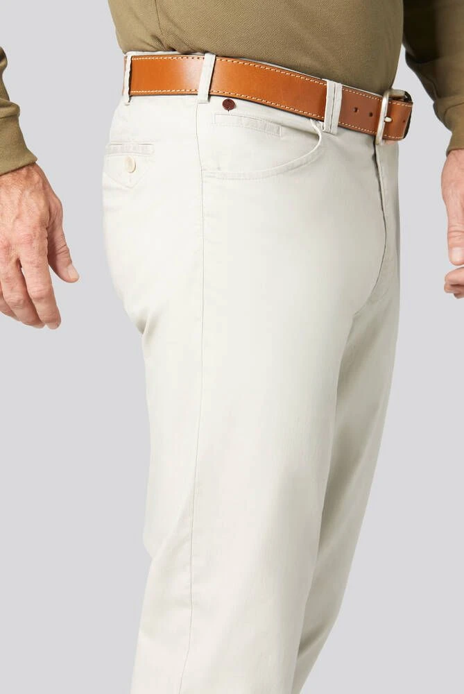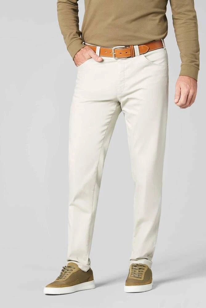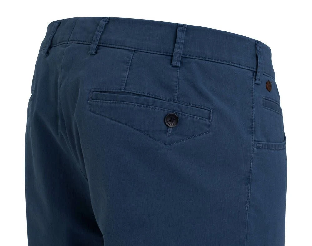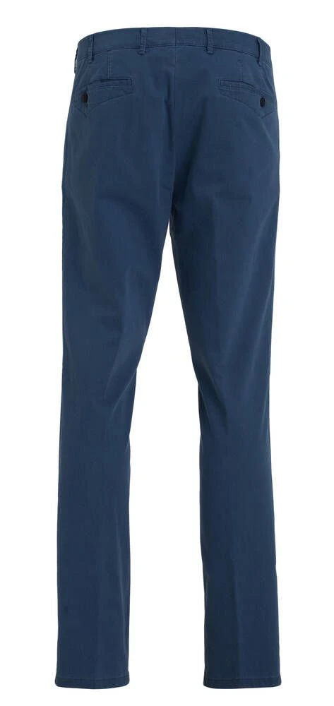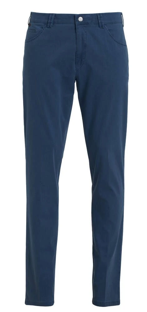 Miesten yksiväriset puuvillahousut etu- ja takataskuilla. Toisen etutaskun sisällä on vetoketjullinen turvatasku. Miellyttävän joustava materiaali parantaa istuvuutta ja lisää housujen käyttömukavuutta.
