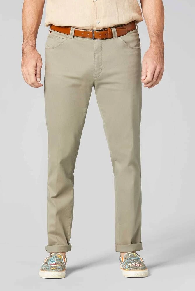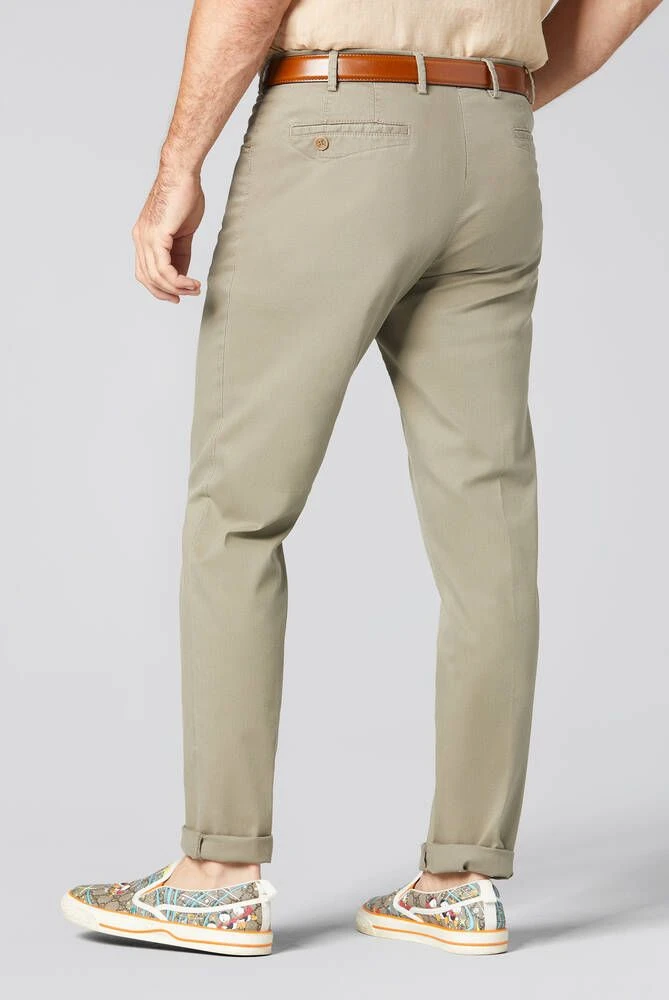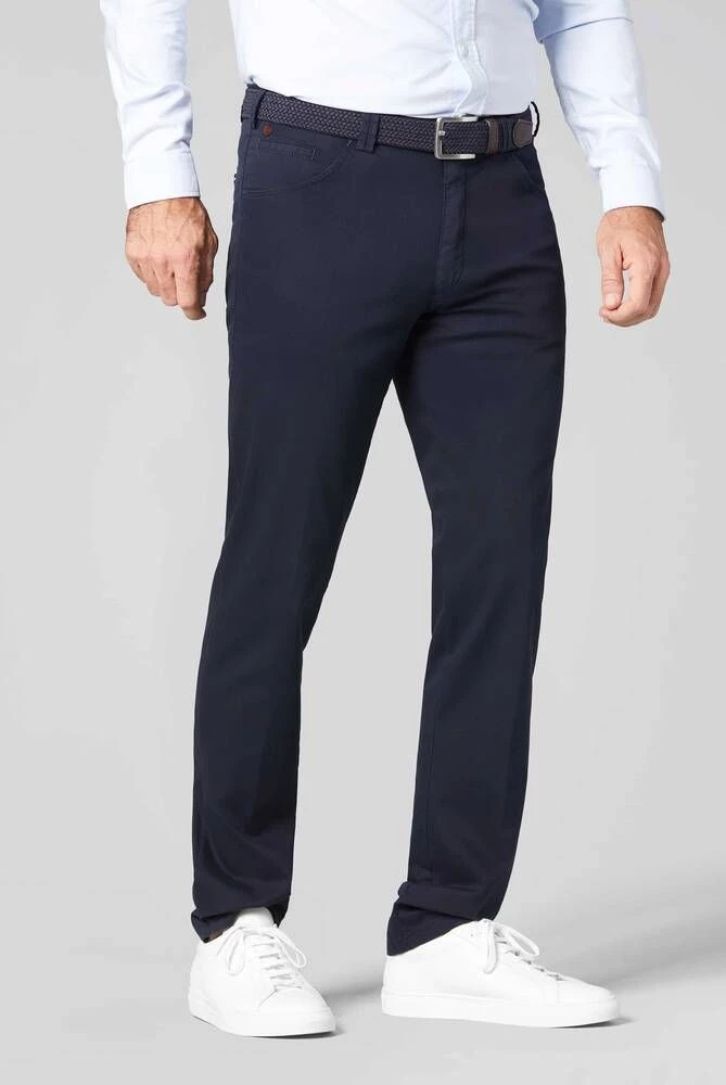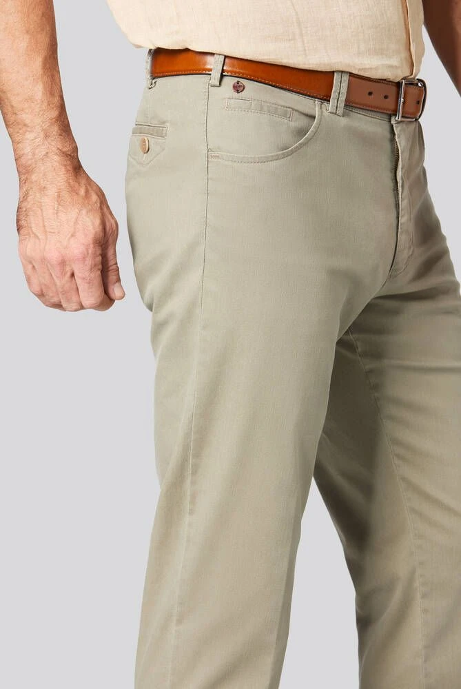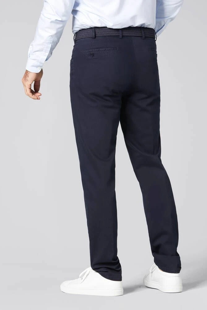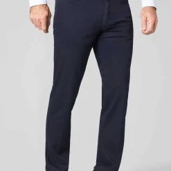 Miesten yksiväriset puuvillahousut etu- ja takataskuilla. Toisen etutaskun sisällä on vetoketjullinen turvatasku. Miellyttävän joustava materiaali parantaa istuvuutta ja lisää housujen käyttömukavuutta.