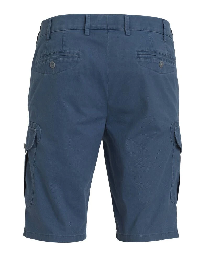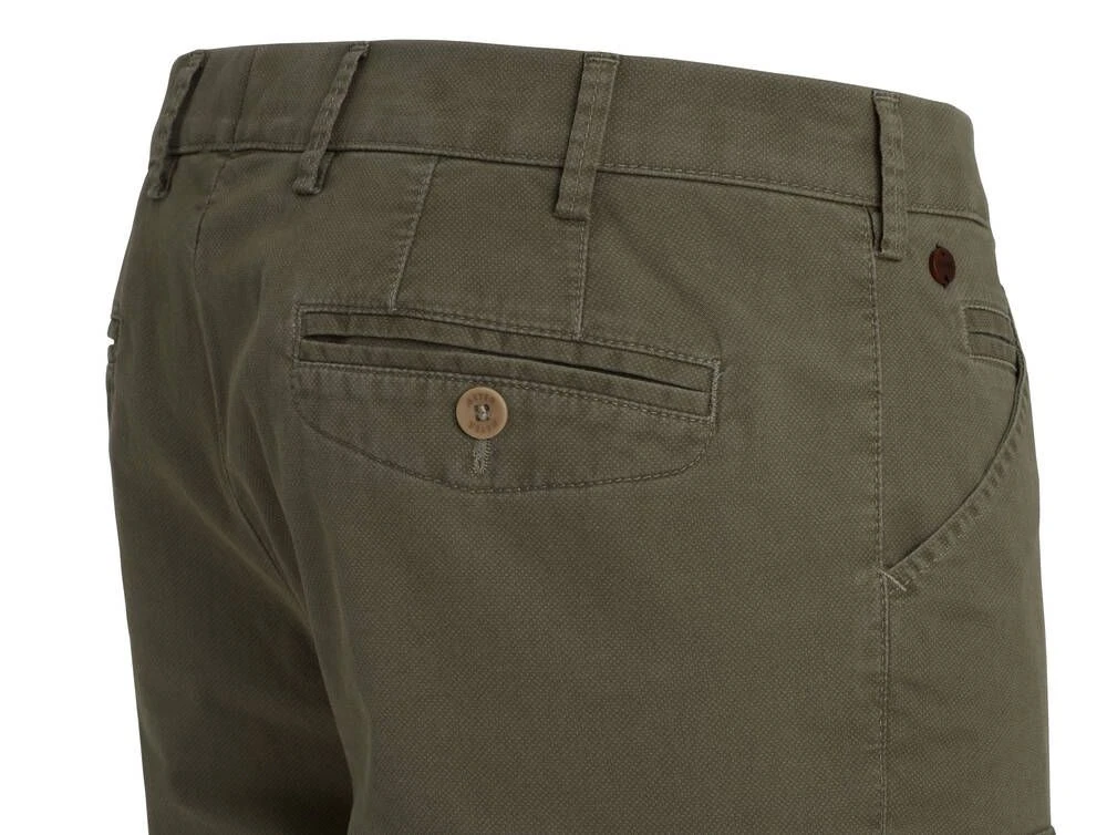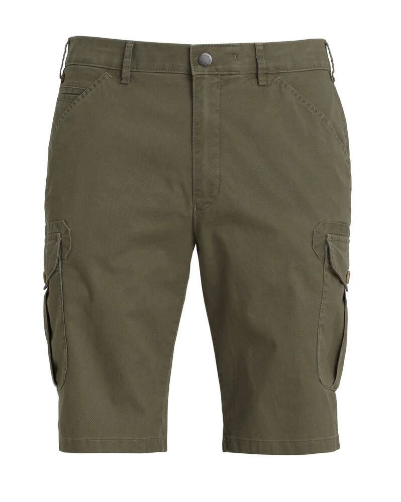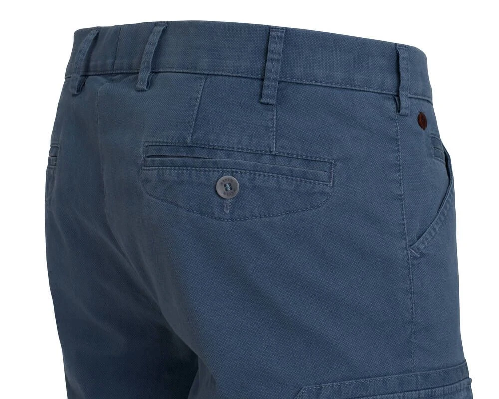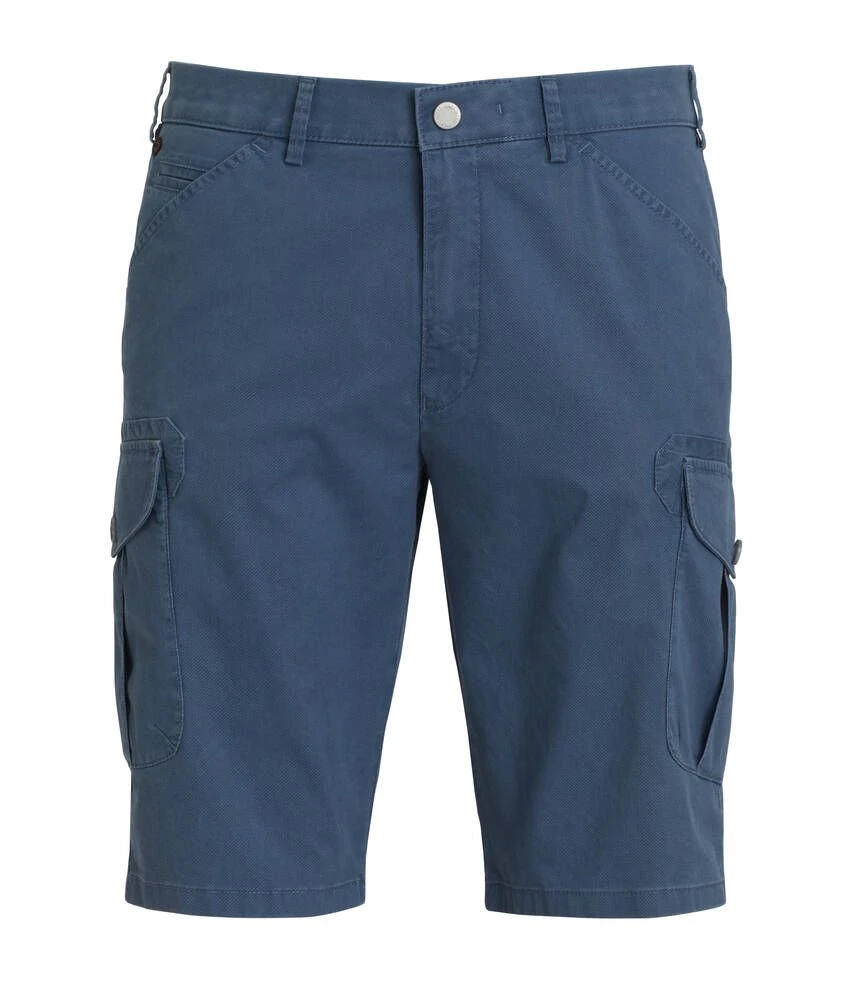 Miesten tyylikkäät reisitaskushortsit etu- ja takataskuilla. Mikroprinttisten shortsien toisen etutaskun sisäpuolella on vetoketjullinen turvatasku.