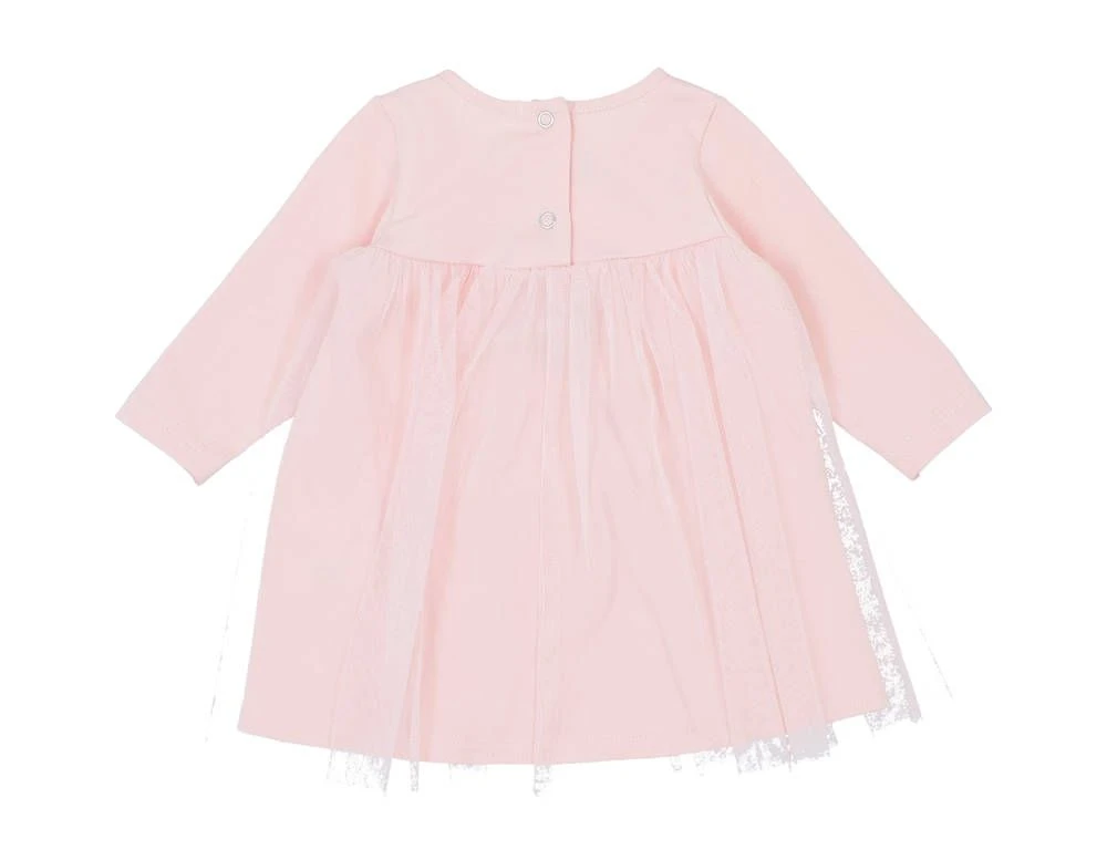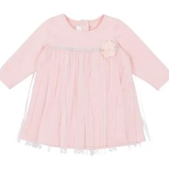 Ihana pitkähihainen trikoomekko suloisella tylliharsohelmalla. Rinnassa on pieni kukkakoriste.