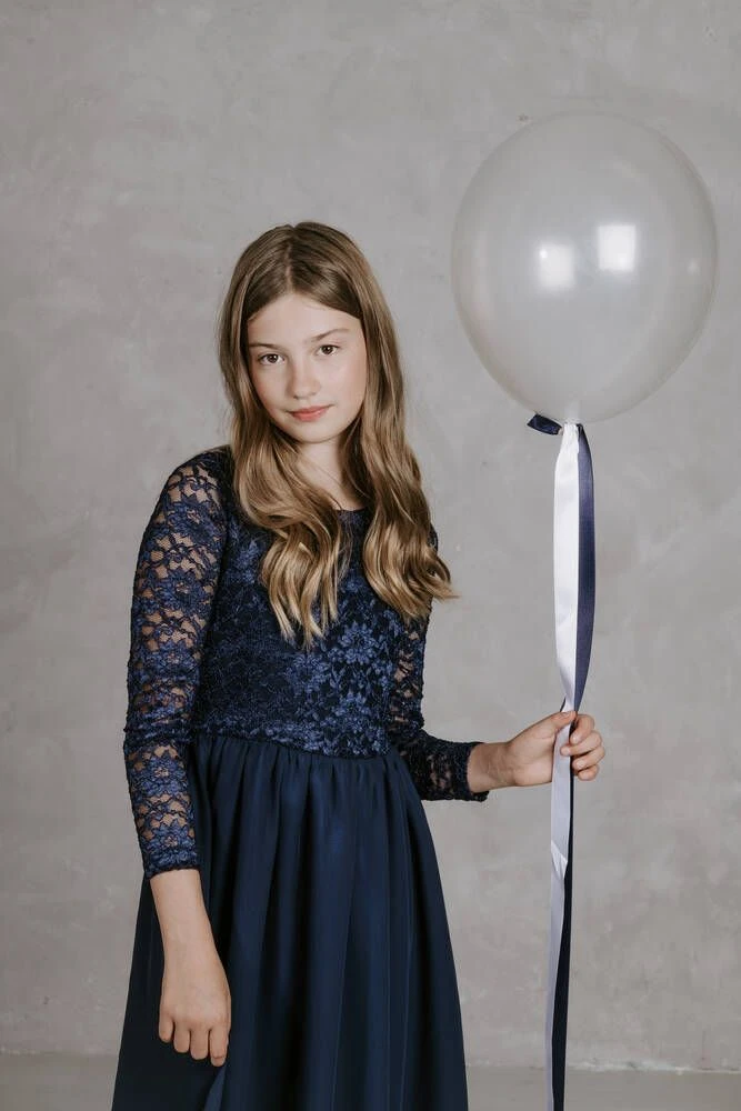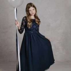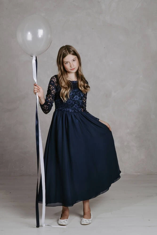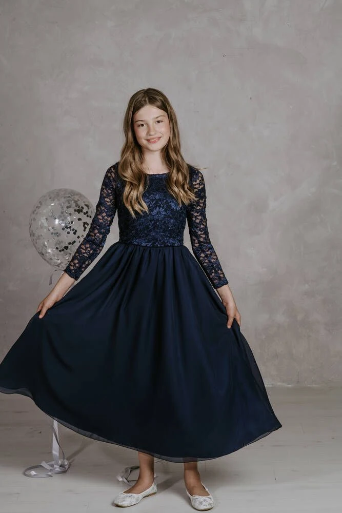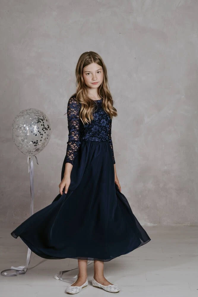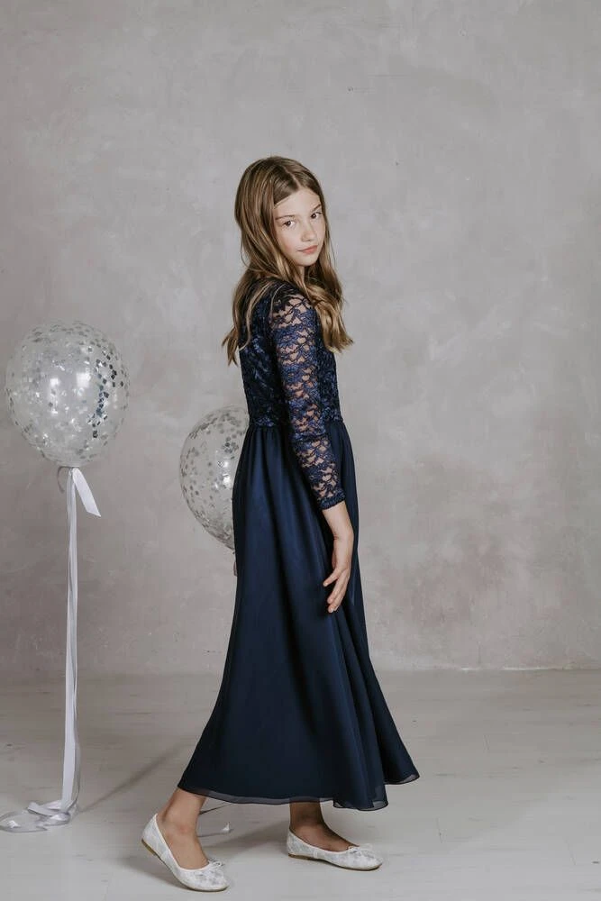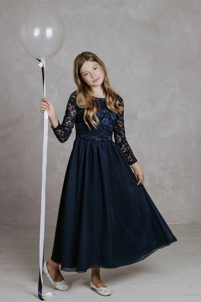 Lasten pitkä juhlamekko pitsiyläosalla ja sifonkihelmalla.