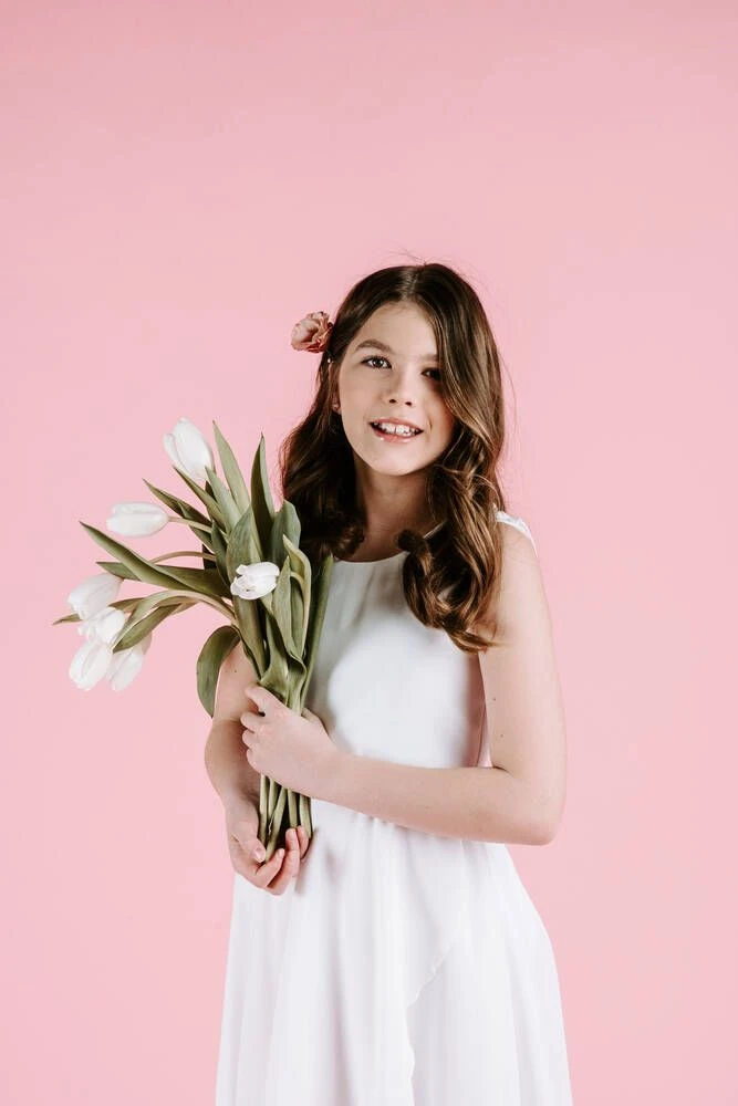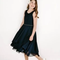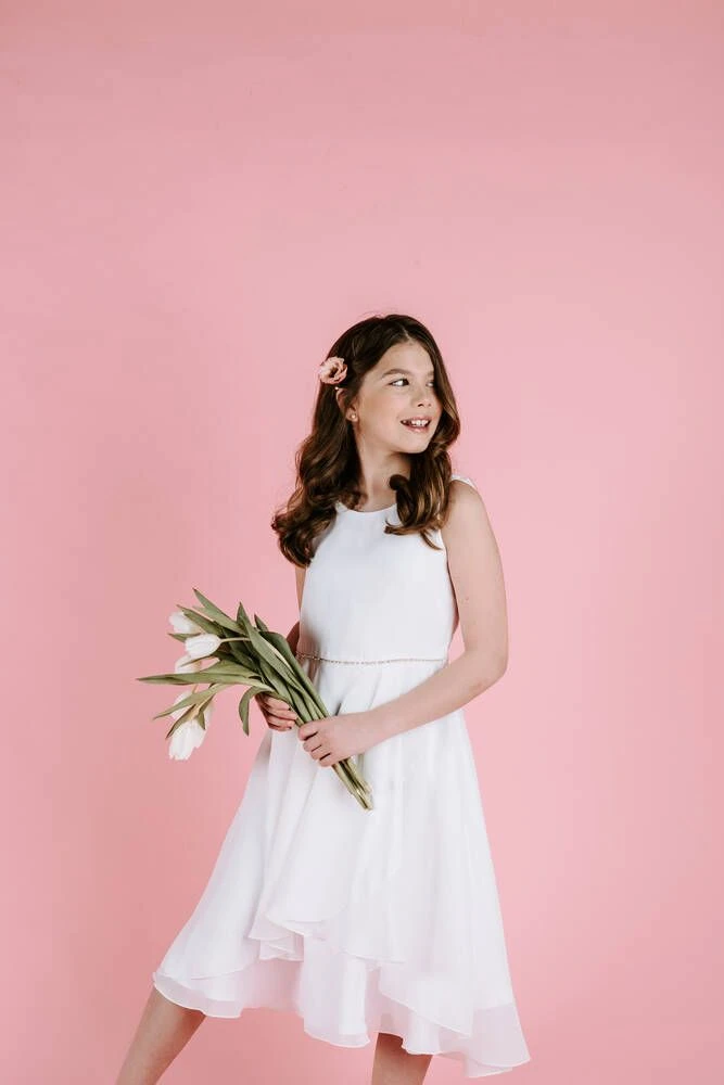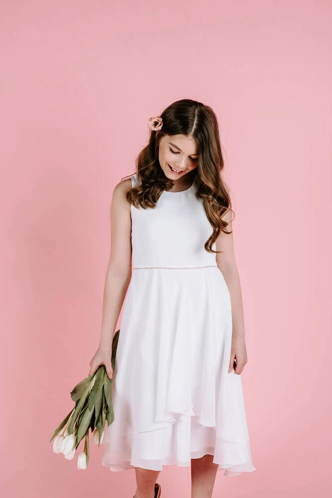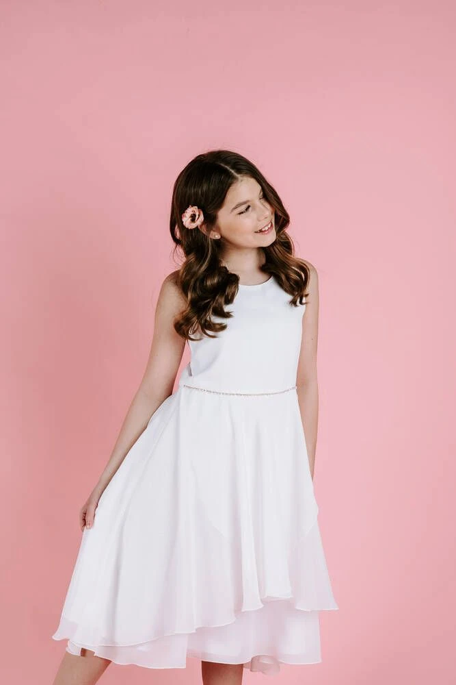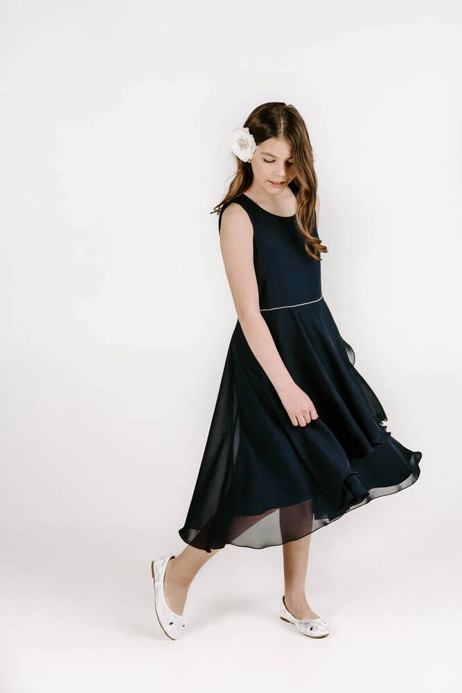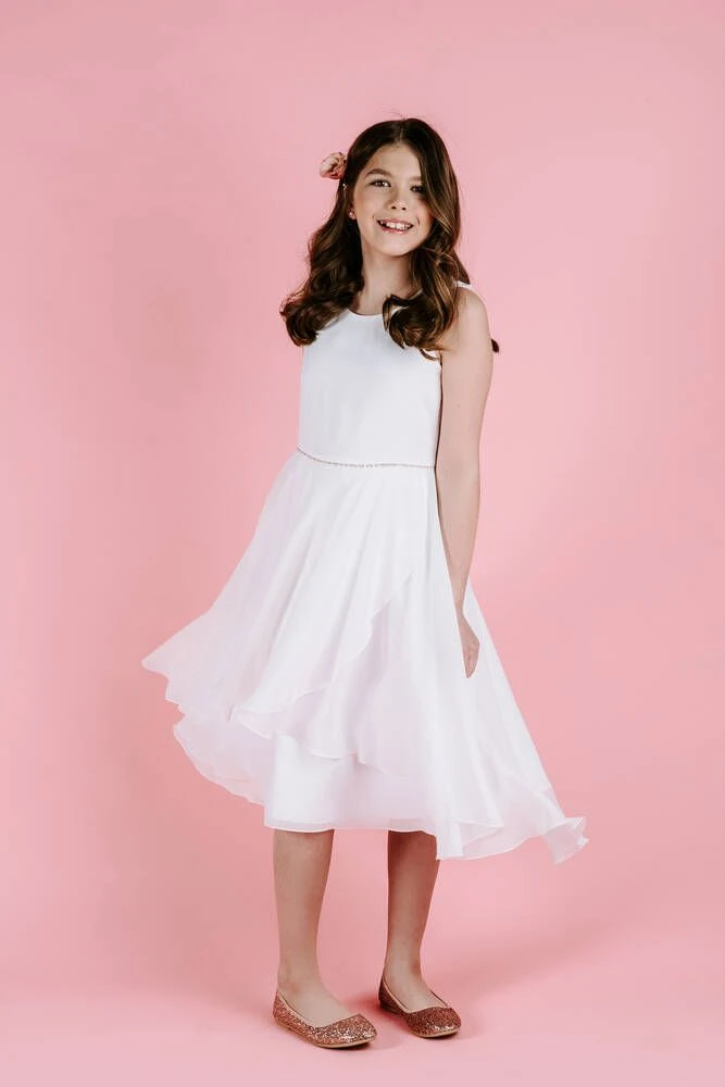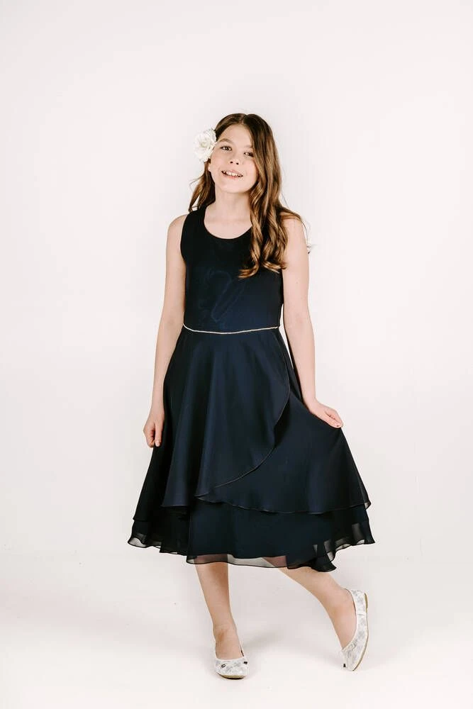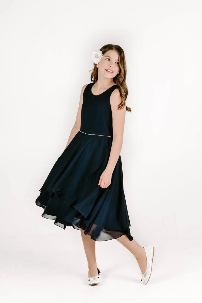 Lasten ihana yksivärinen sifonkimekko upealla kerroshelmalla.