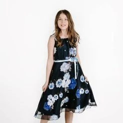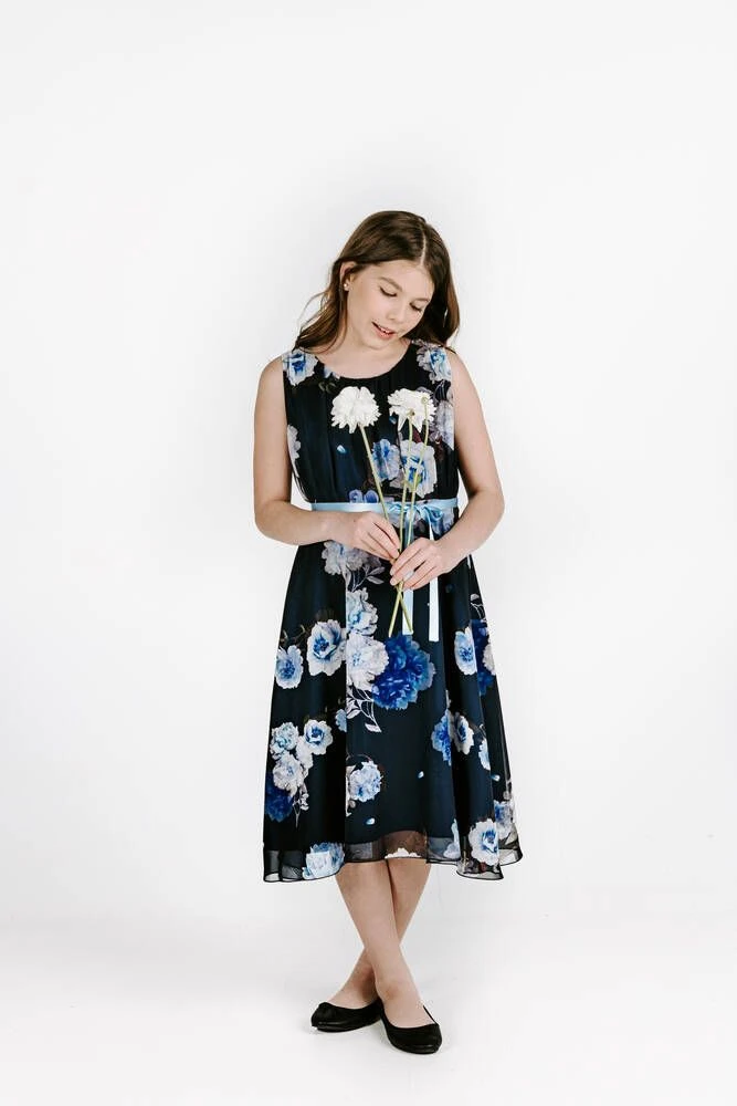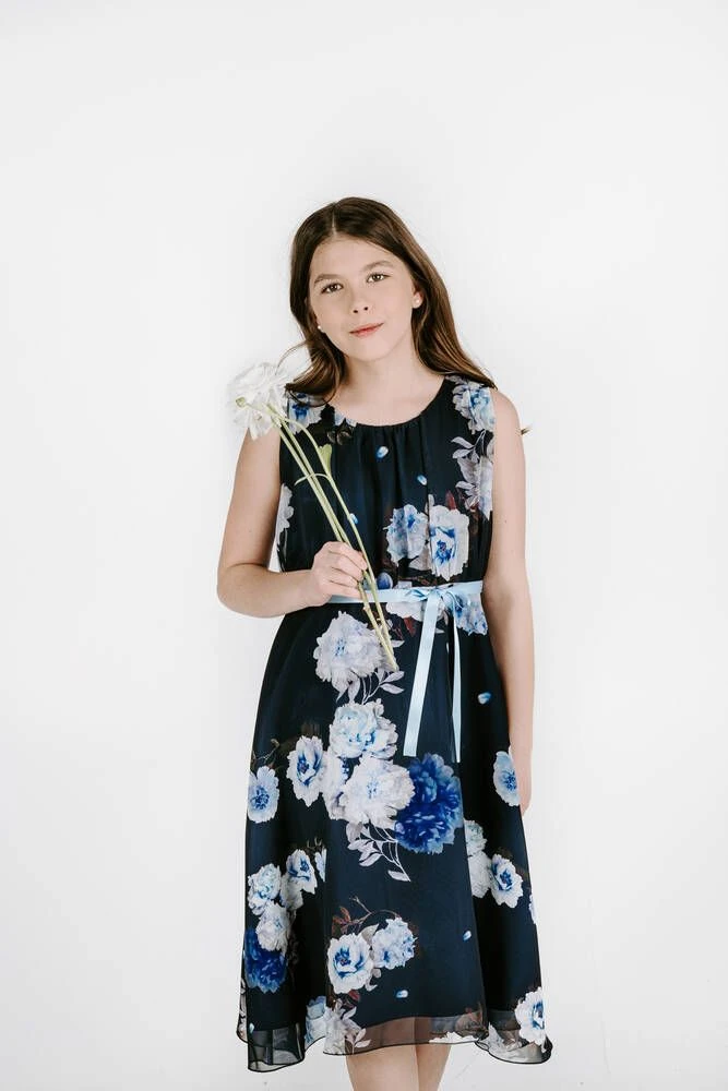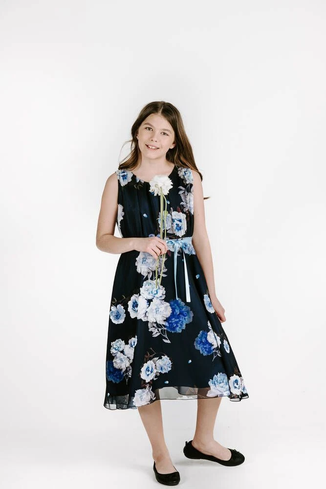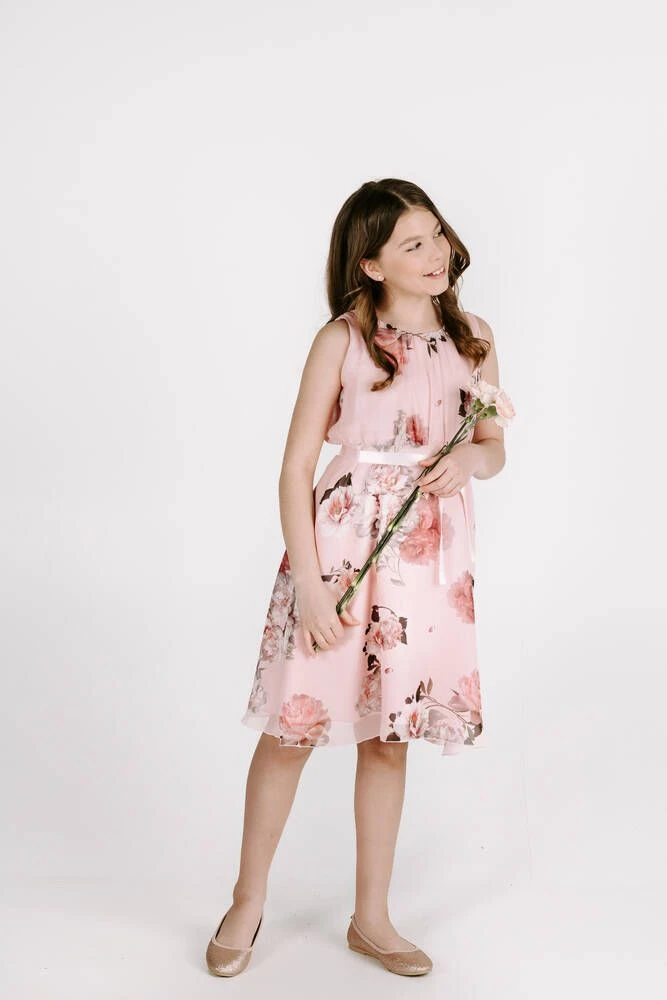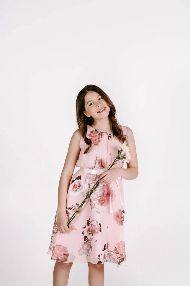 Lasten hihaton sifonkimekko upealla pioniprintillä. Pääntieltä lähtee kauniit laskokset.