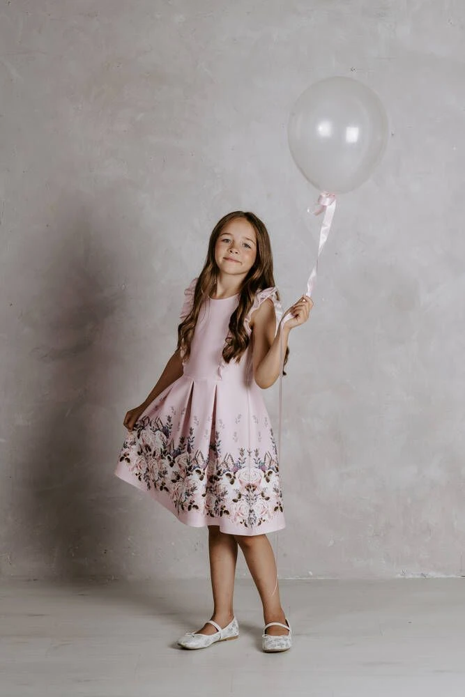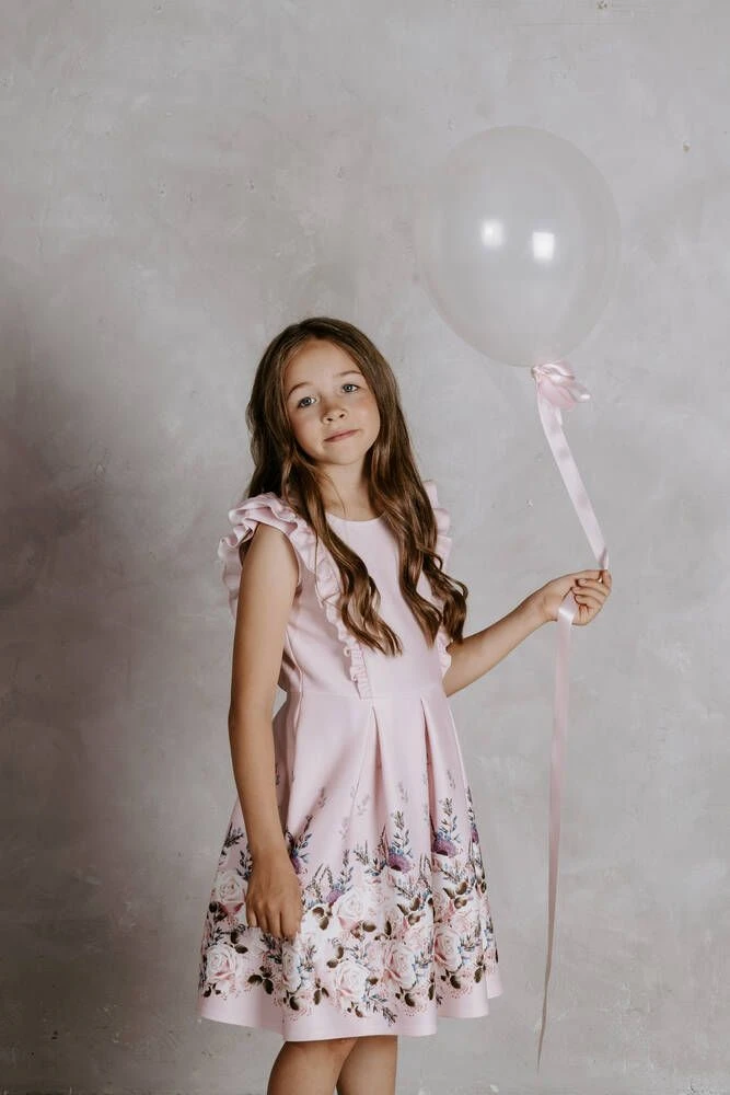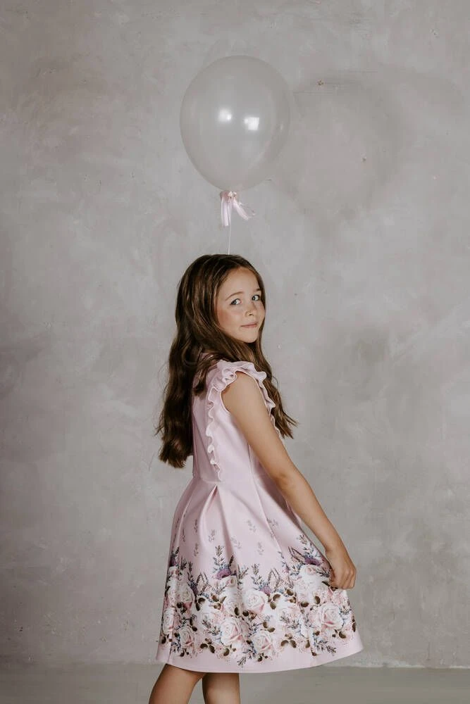 Lasten tukevakankainen juhlamekko upealla ruusukuvioinnilla.