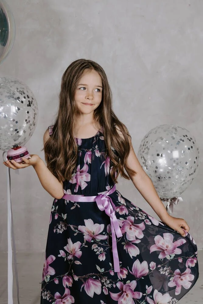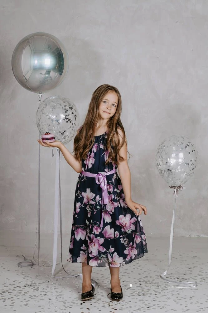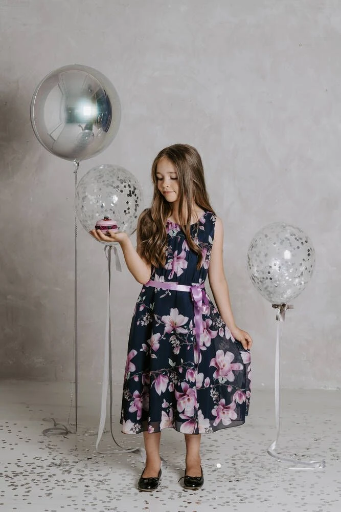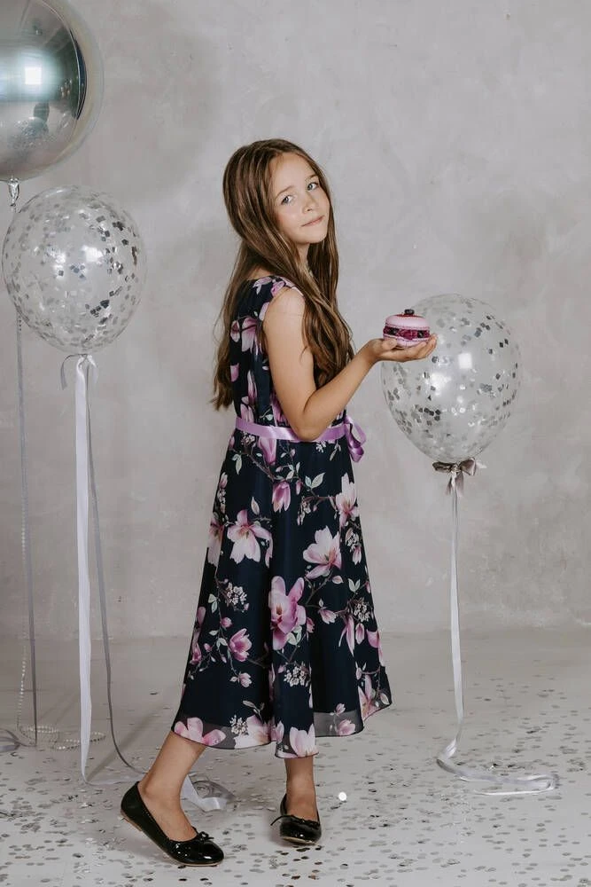Lasten kukallinen sifonkimekko vyötärölle kiinnitettävällä satiinivyöllä.
