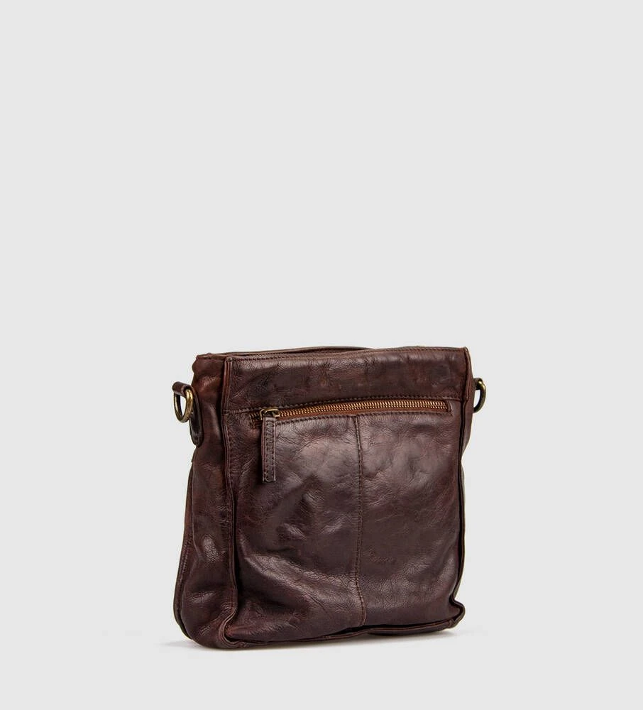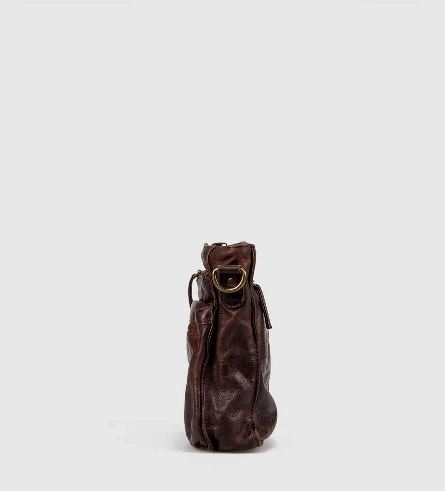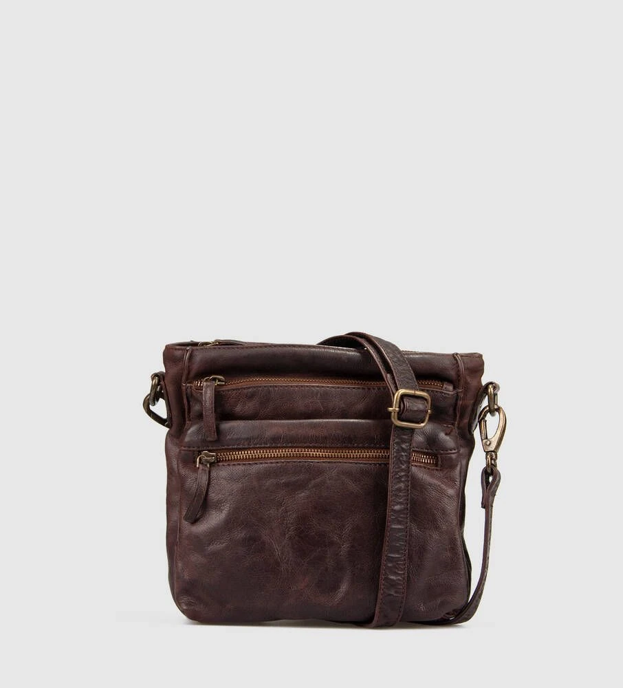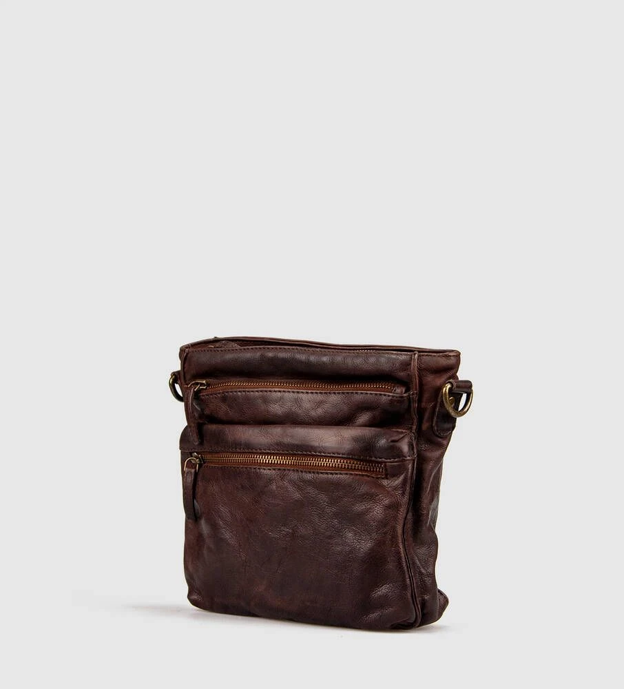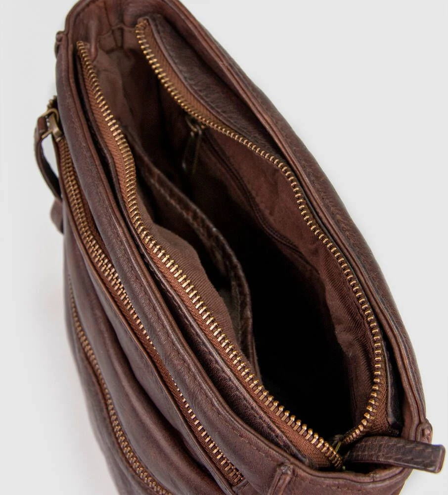 Tyylikäs nahkainen olkalaukku vetoketjullisilla taskuilla.