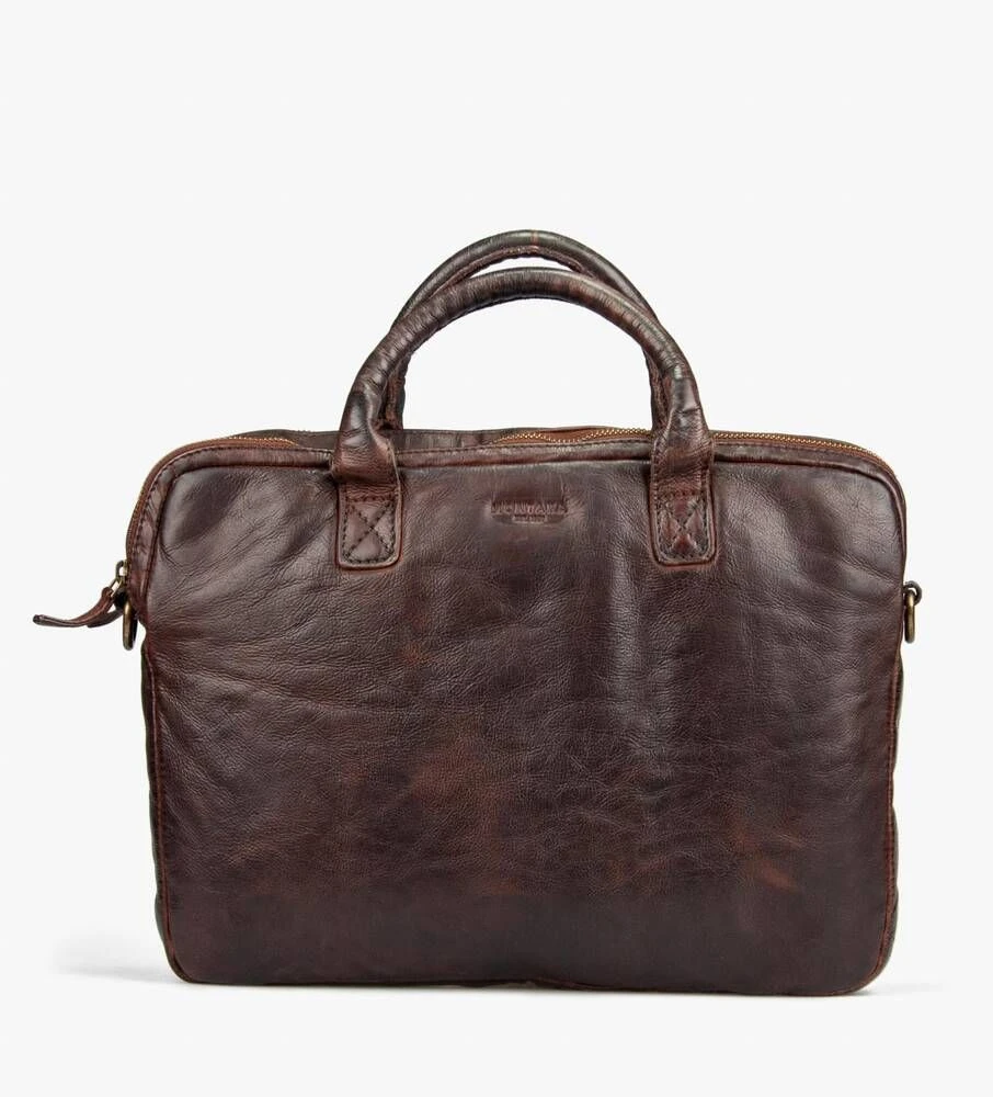 Tyylikäs nahkainen läppärilaukku säädettävällä olkahihnalla.