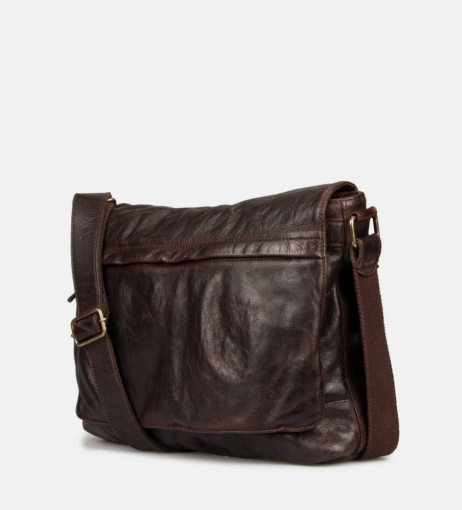 Nahkapintainen läppärilaukku säädettävällä olkahihnalla.