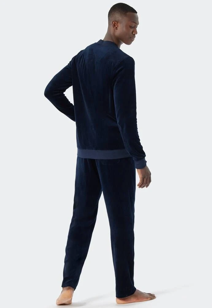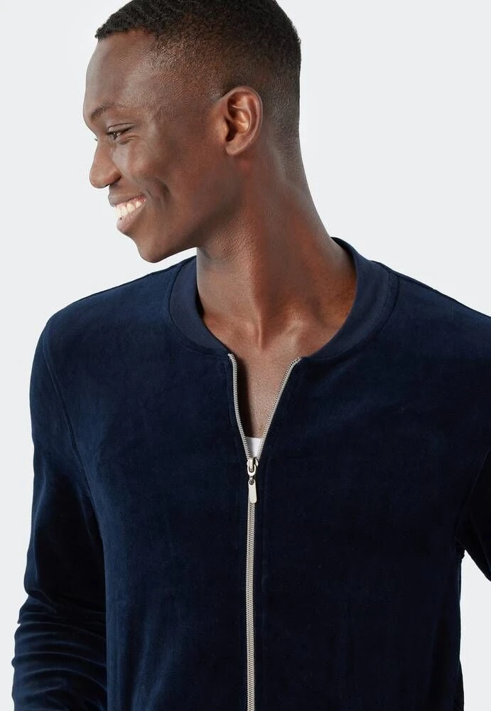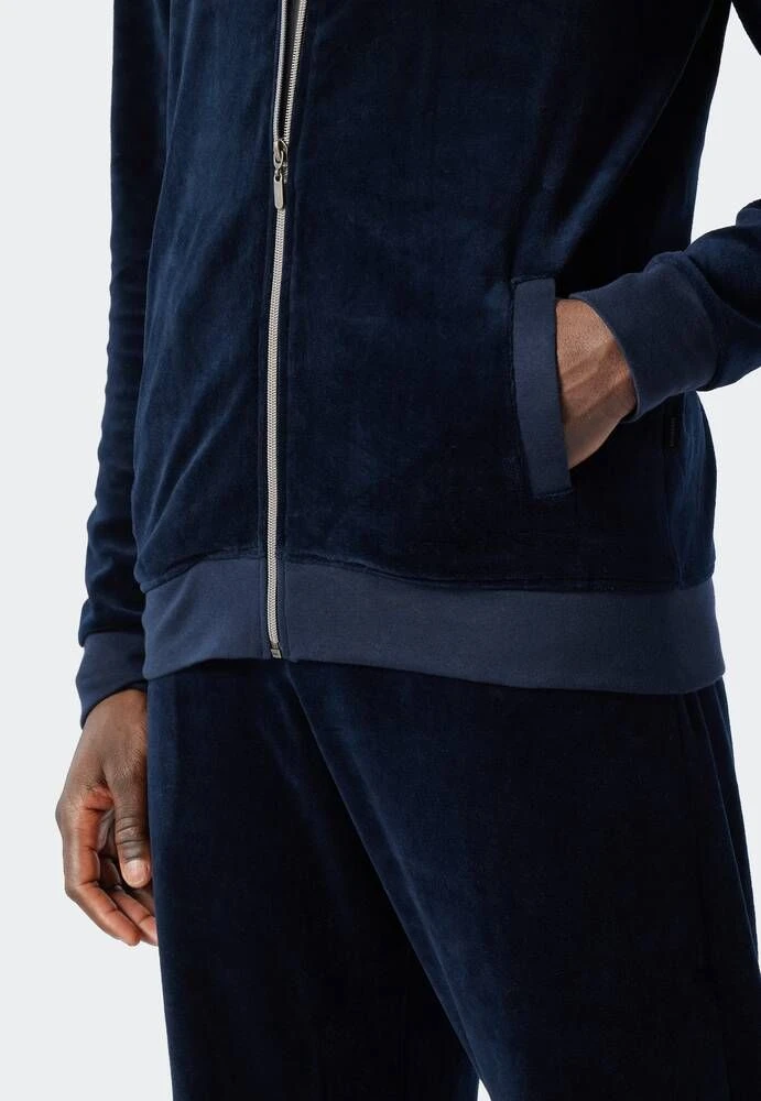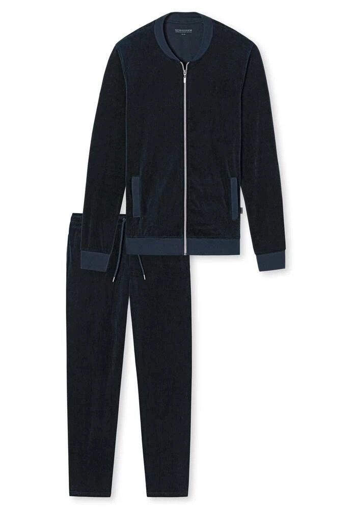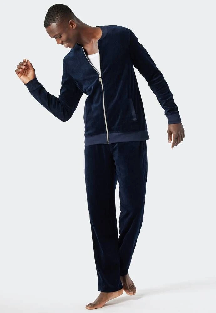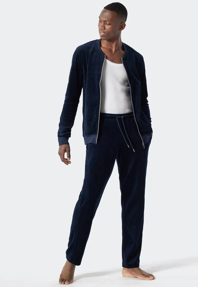 Miesten pehmeä oloasu vetoketjullisella yläosalla. Hosuissa on kiristysnauha.