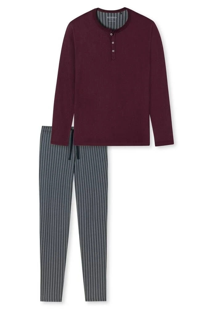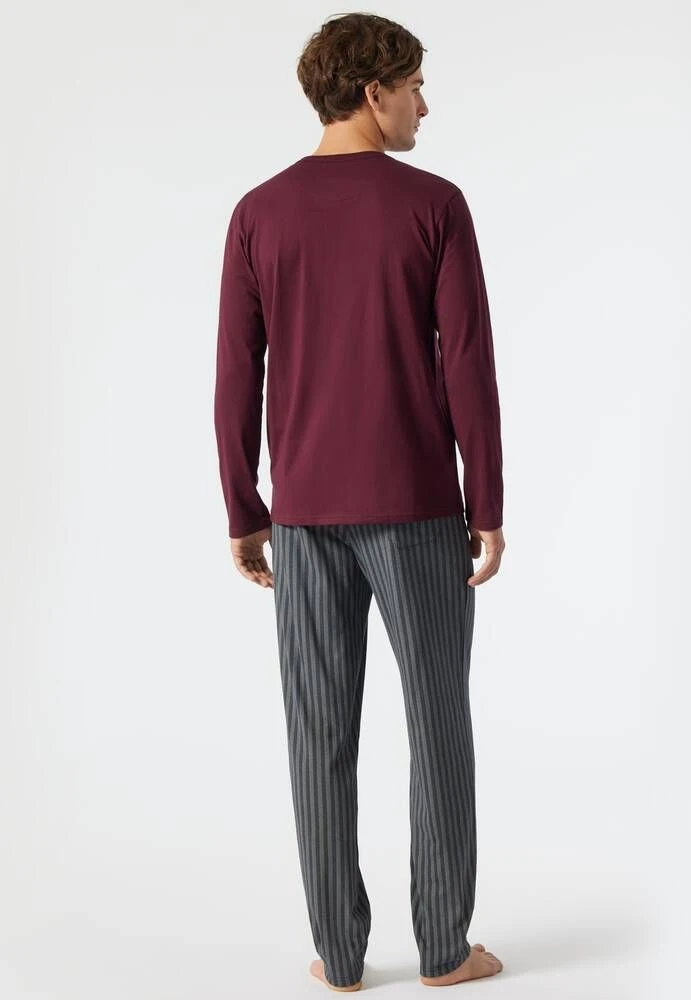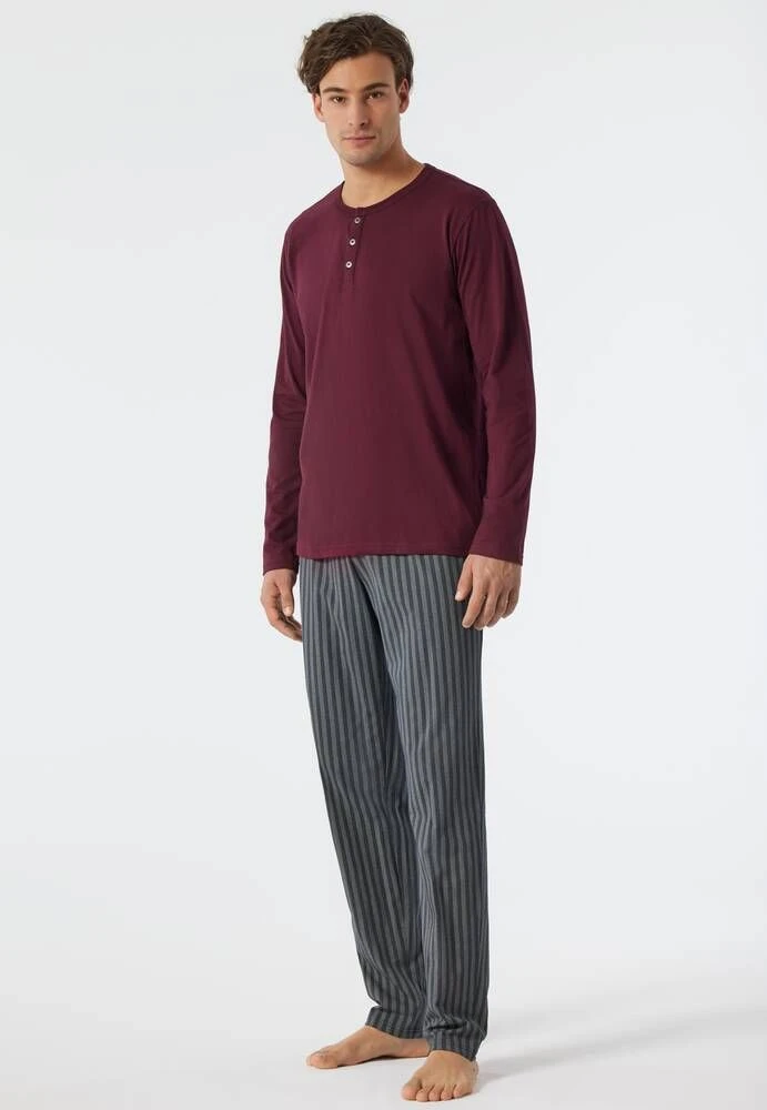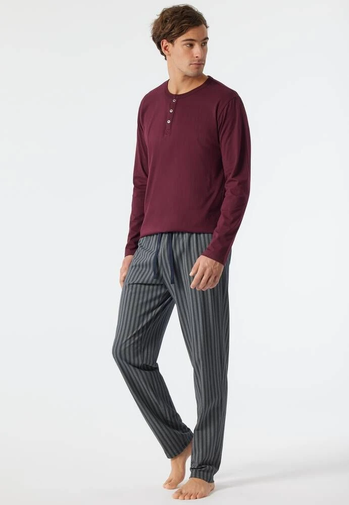 Miesten pyjama yksivärisellä yläosalla ja raidallisella alaosalla. Housuissa on kiristettävä nyöri.