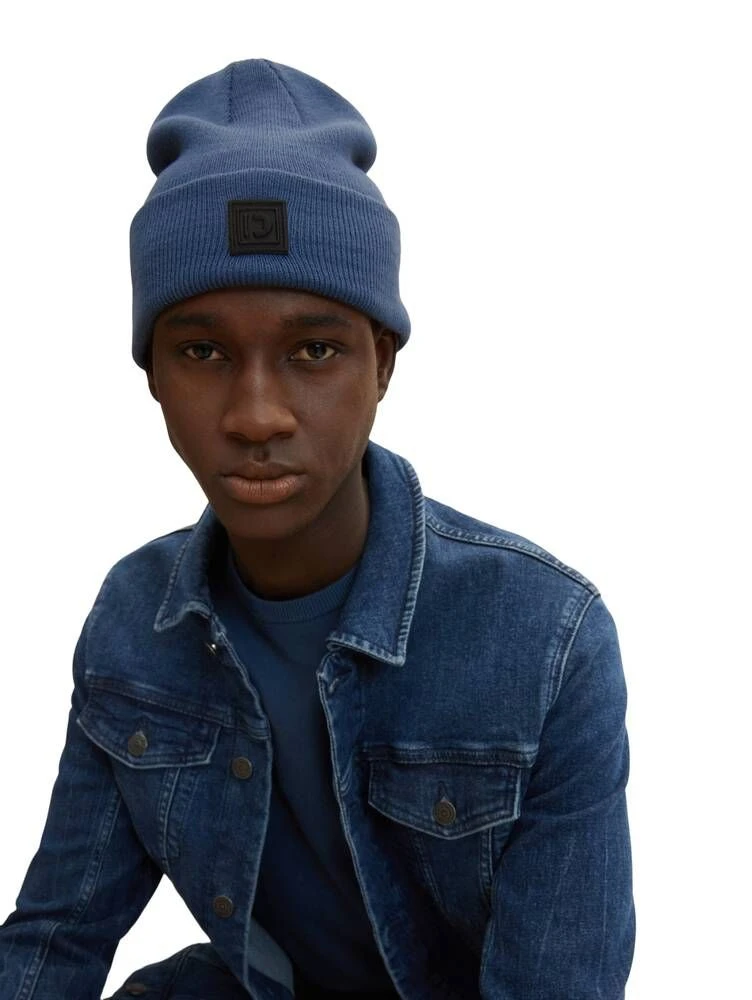 Yksivärinen Beanie-pipo pienellä mustalla merkillä.