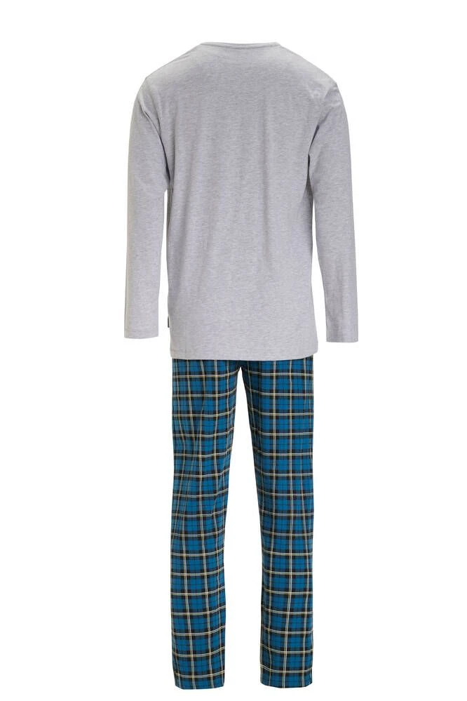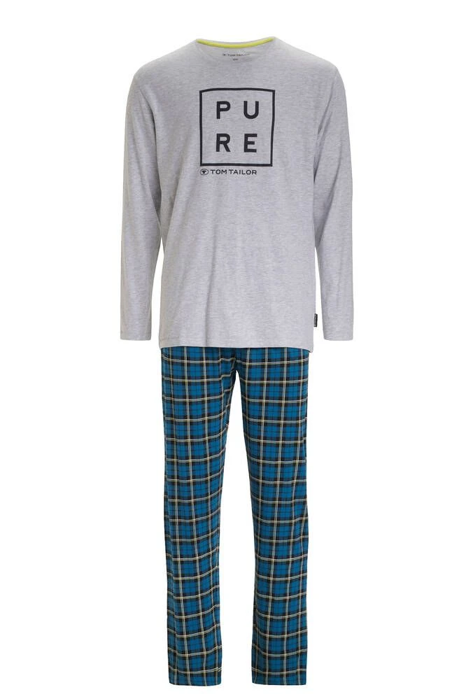 Rento pyjama pitkähihaisella paidalla ja leveillä housuilla. Paidan etupuolella on iso tekstiprintti ja housuissa näyttävä ruutukuosi.
