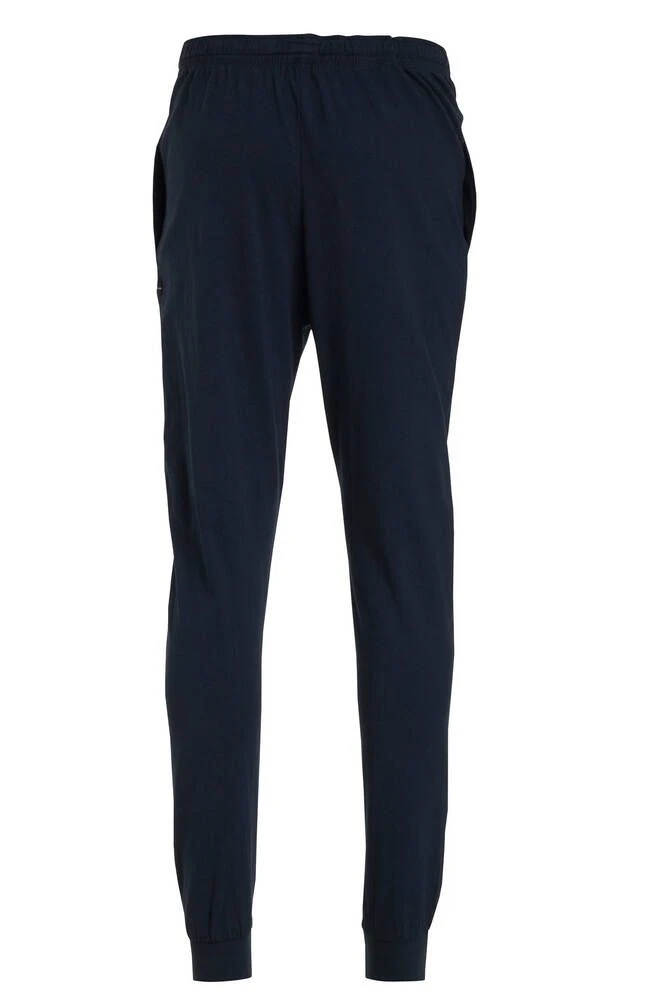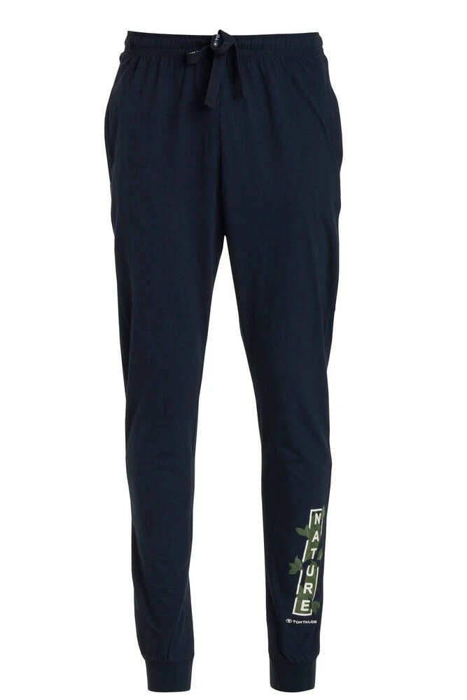 Puuvillaiset pyjamahousut joustavalla kuminauhavyötäröllä ja etupuolen avotaskuilla. Toisessa lahkeessa on rento tekstiprintti ja lahkeensuissa leveät resorit.